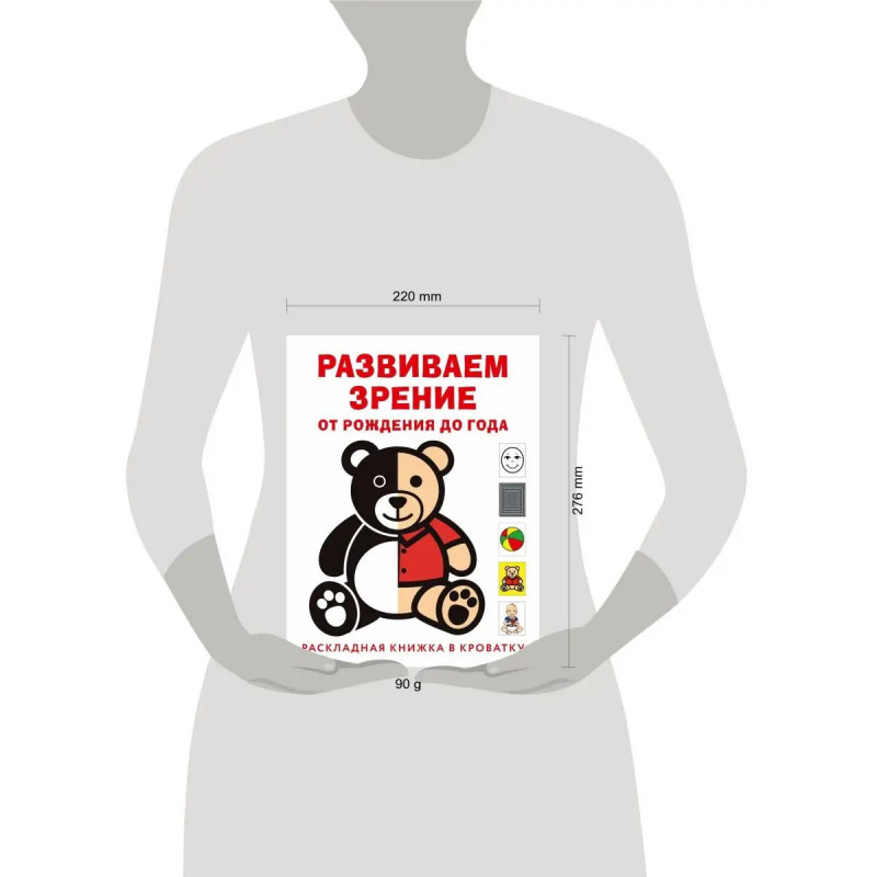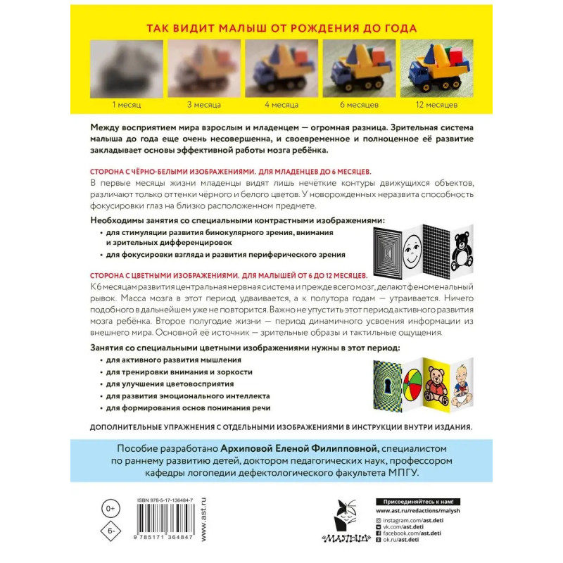 Между восприятием мира взрослым и младенцем огромная разница. Зрительная система малыша до года еще очень несовершенна, и своевременное и полноценное её развитие закладывает основы эффективной работы мозга ребёнка. СТОРОНА С ЧЁРНО-БЕЛЫМИ ИЗОБРАЖЕНИЯМИ. ДЛЯ МЛАДЕНЦЕВ ДО 6 МЕСЯЦЕВ. Необходимы занятия со специальными контрастными изображениями: для стимуляции развития бинокулярного зрения, внимания и зрительных дифференцировок для фокусировки взгляда и развития периферического зрения СТОРОНА С ЦВЕТНЫМИ ИЗОБРАЖЕНИЯМИ. ДЛЯ МАЛЫШЕЙ ОТ 6 ДО 12 МЕСЯЦЕВ. Занятия со специальными цветными изображениями нужны в этот период: для активного развития мышления для тренировки внимания и зоркости для улучшения цветовосприятия для развития эмоционального интеллекта для формирования основ понимания речи ДОПОЛНИТЕЛЬНЫЕ УПРАЖНЕНИЯ С ОТДЕЛЬНЫМИ ИЗОБРАЖЕНИЯМИ В ИНСТРУКЦИИ ВНУТРИ ИЗДАНИЯ. Пособие разработано Архиповой Еленой Филипповной, специалистом по раннему развитию детей, доктором педагогических наук, профессором