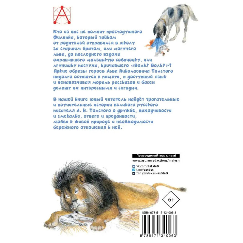 Кто из нас не помнит простодушного Филипка, который тайком от родителей отправился в школу за старшим братом, или могучего льва, до последнего вздоха охранявшего маленькую собачонку, или лгунишку пастуха, кричавшего Волк! Волк!? Яркие образы героев Льва Николаевича Толстого надолго остаются в памяти, а доступный язык и ненавязчивая мораль рассказов и басен делают их интересными и сегодня. В нашей книге юный читатель найдёт трогательные и поучительные истории великого русского писателя Л. Н. Толстого о дружбе, находчивости и смекалке, отваге и преданности, любви к живой природе и необходимости бережного отношения к ней.