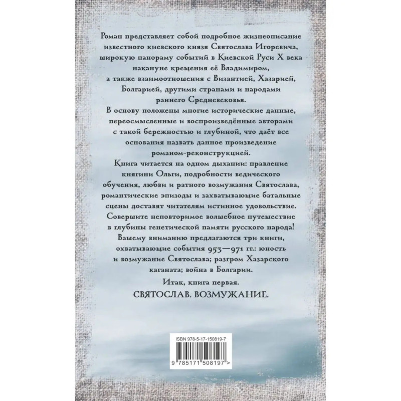 Валентин и Юлия Гнатюк, авторы ряда книг на древнеславянскую тематику, среди которых замечательная трилогия о его внуке князе Святославе Хоробром. Увлекательная правдивая история о князе Cвятославе читается на одном дыхании. В основу положены многие исторические данные, переосмысленные и воспроизведённые авторами с такой бережностью и глубиной, что даёт все основания назвать данное произведение романом-реконструкцией. Факты, описанные в книге, в школьной программе не упоминаются. Интересна для углубленного понимания истории славян. - Уникальные исторические факты про правление Святослава. - Факты, описанные в книге, в школьной программе не упоминаются. - Интересна для углубленного понимания истории славян. Роман "Святослав. Возмужание" представляет собой подробное жизнеописание известного киевского князя Святослава Игоревича, широкую панораму событий в Киевской Руси X века накануне крещения её Владимиром, а также взаимоотношения с Византией, Хазарией, Болгарией, другими странами и народами раннего средневе