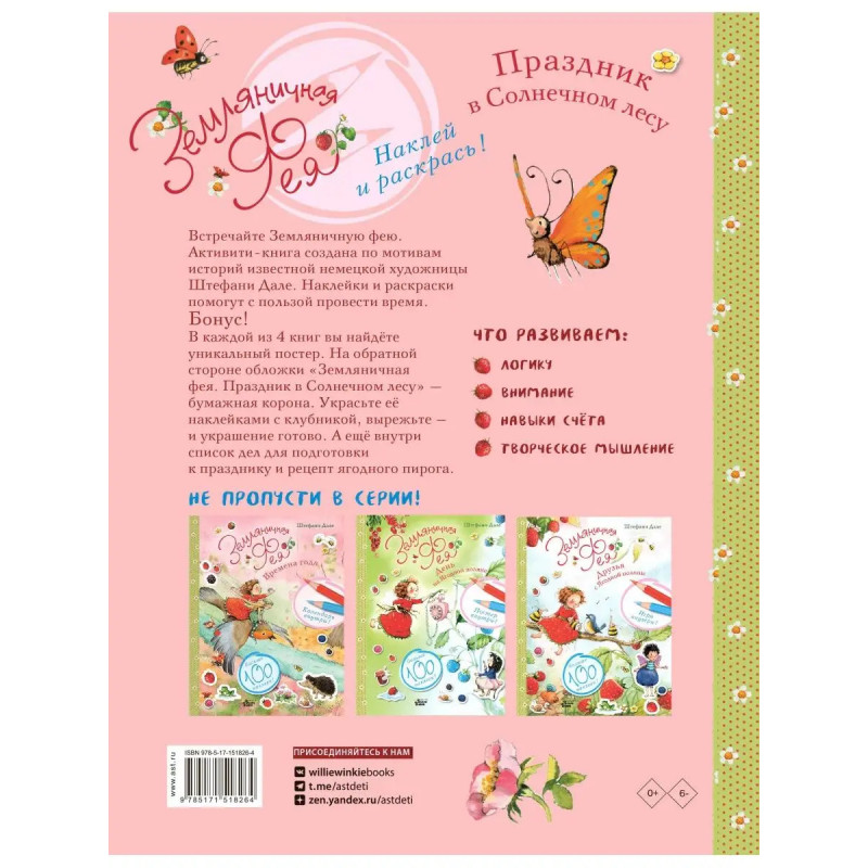 3 фишки: Возраст 3-6 лет 1 наклеек Бонус! Корона внутри Раскраски и наклейки с популярным персонажем из серии книг о Земляничной фее увлекут ребенка. Бонус! В каждой из 4 книг вы найдете уникальный постер. На обратной стороне обложки Земляничная фея. Праздник в Солнечном лесу бумажная корона. Украсьте ее наклейками с клубникой, вырежьте и украшение готово. А еще внутри список дел для подготовки к празднику и рецепт ягодного пирога. Что развиваем: Логику Внимание Навыки счета Творческое мышление