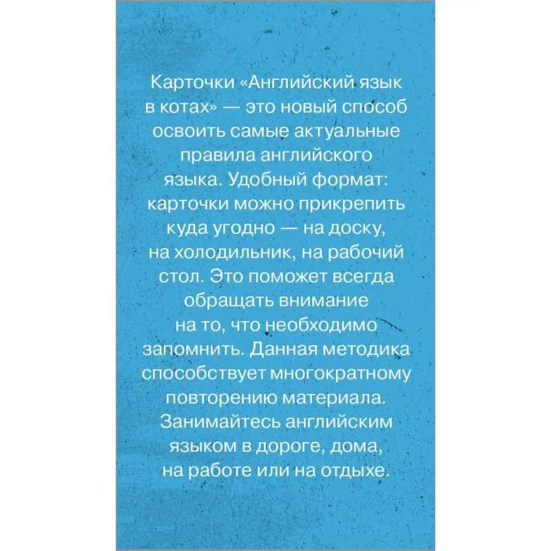 Автор популярного в Интернете "Русского языка в котах" представляет карточки-шпаргалки "Английский язык в котах", которые моментально решат все ваши проблемы в изучении английского языка. Забудьте про зубрежку! Красочные иллюстрации с уже знакомыми и полюбившимися всем котиками помогут разобраться даже в самых сложных правилах английского языка, а также с легкостью запомнить новые слова благодаря предложенным автором ассоциациям. Карточки послужат прекрасным дополнением к пособиям по изучению английского языка и подойдут для любого уровня владения языком.