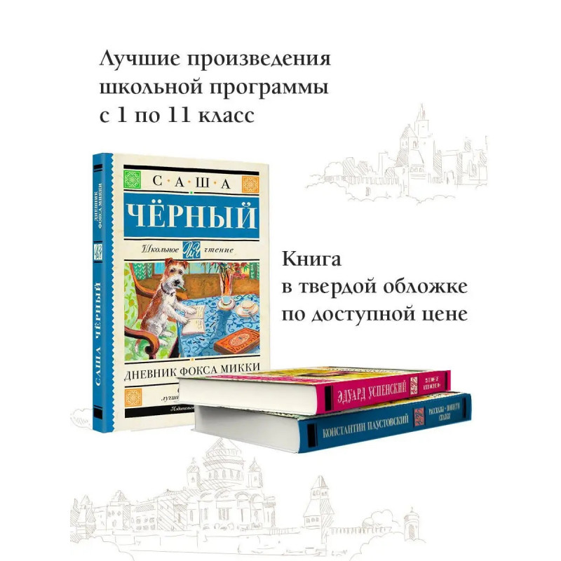 А что, если бы мы могли взглянуть на мир глазами... собаки? Такую возможность даёт классическая повесть поэта и прозаика Саши Чёрного. "Дневник Фокса Микки" весёлые рассказы, написанные от лица фокстерьера Микки. Микки мыслитель и поэт замечает все тонкости и перипетии происходящих с ним событий, остроумно описывает свои радости и огорчения, взаимоотношения с окружающим мирам, ведёт путевой дневник. Читая дневник фокстерьера Микки, юные читатели обязательно полюбят животных и задумаются об ответственности тех, кто заводит четвероногих друзей. В книгу также вошли стихи писателя из сборников "Детский остров", "Весёлые глазки", "Зверюшки", "Песенки", истории из "Библейских сказок" и другие. В серию включены лучшие произведения отечественной и зарубежной литературы, входящие в школьную программу с 1 по 11 класс и в списки дошкольного чтения. Книги в твердом переплёте сделают знакомство с литературой легким и увлекательным. Серия, которая не ударит по семейному бюджету и поможет юному читателю расти н