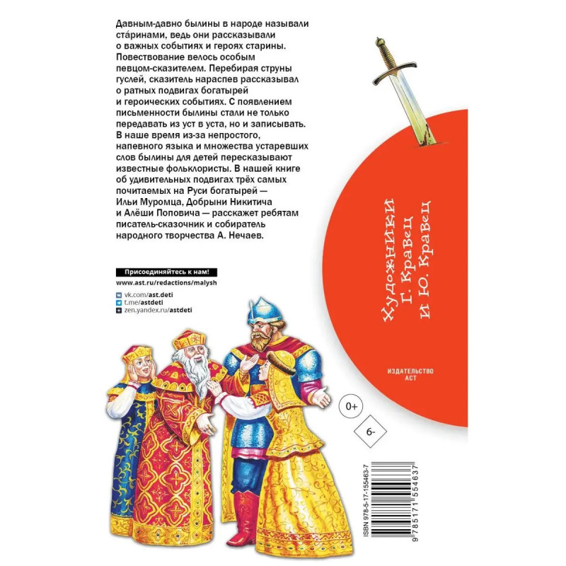 Давным-давно былины в народе называли старинами, ведь они рассказывали о важных событиях и героях старины. Повествование велось особым певцом-сказителем. Перебирая струны гуслей, сказитель нараспев рассказывал о ратных подвигах богатырей и героических событиях. С появлением письменности былины стали не только передавать из уст в уста, но и записывать. В наше время из-за особого, напевного языка и множества устаревших слов былины пересказывают для детей известные фольклористы. В нашей книге об удивительных подвигах трёх самых почитаемых на Руси богатырей Ильи Муромца, Добрыни Никитича и Алёши Поповича расскажет ребятам писатель-сказочник и собиратель народного творчества А. Нечаев.