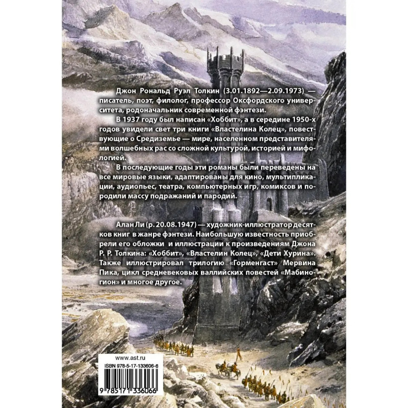 Джон Рональд Руэл Толкин (3.1.18922.9.1973) писатель, поэт, филолог, профессор Оксфордского университета, родоначальник современной фэнтези. В 1937 году был написан "Хоббит", а в середине 195-х годов увидели свет три книги "Властелина Колец", повествующие о Средиземье мире, населенном представителями волшебных рас со сложной культурой, историей и мифологией.В последующие годы эти романы были переведены на все мировые языки, адаптированы для кино, мультипликации, аудиопьес, театра, компьютерных игр, комиксов и породили массу подражаний и пародий. Алан Ли (р. 2.8.1947) художник-иллюстратор десятков книг в жанре фэнтези. Наибольшую известность приобрели его обложки и иллюстрации к произведениям Джона Р. Р. Толкина: "Хоббит", "Властелин Колец", "Дети Хурина". Также иллюстрировал трилогию "Горменгаст" Мервина Пика, цикл средневековых валлийских повестей "Мабиногион" и многое другое.
