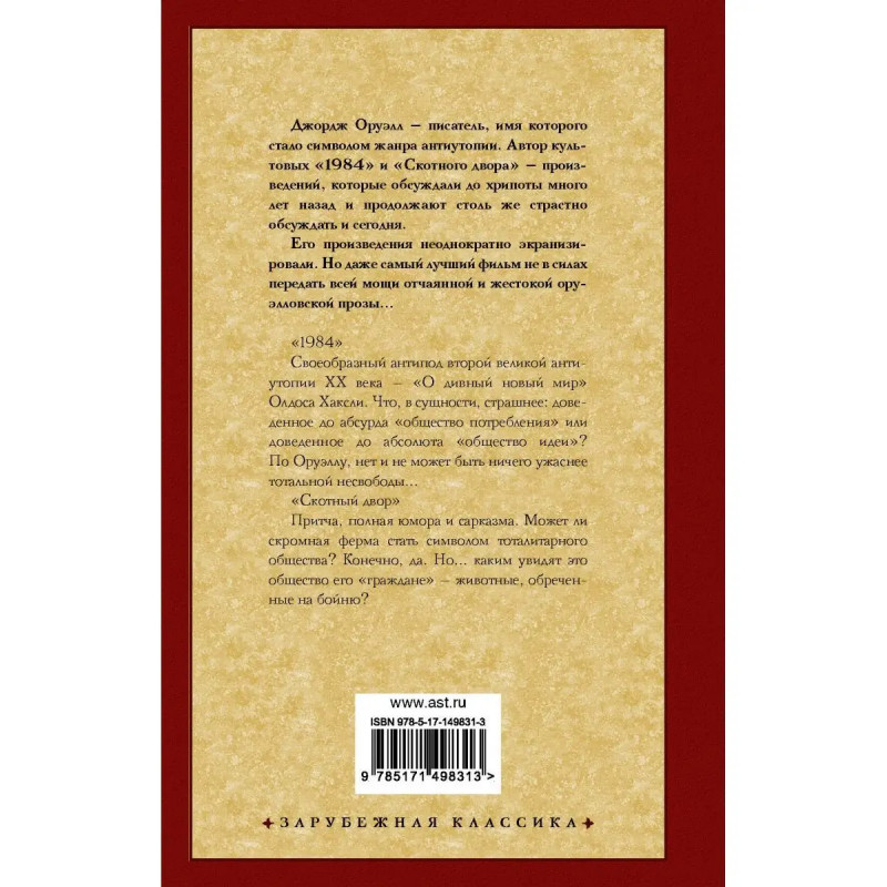 Два легендарных произведения Джорджа Оруэлла под одной обложкой! 1984 одна из великих антиутопий XX века, не утратившая актуальности и спустя 75 лет после написания. В этом издании 1984 публикуется в новом полном, без цензуры и купюр, переводе Дарьи Целовальниковой. "1984". Своеобразный антипод второй великой антиутопии XX века "О дивный новый мир" Олдоса Хаксли. Что, в сущности, страшнее: доведенное до абсурда "общество потребления" или доведенное до абсолюта "общество идеи"? По Оруэллу, нет и не может быть ничего ужаснее тотальной несвободы... "Скотный двор". Притча, полная юмора и сарказма. Может ли скромная ферма стать символом тоталитарного общества? Конечно, да. Но... каким увидят это общество его "граждане" животные, обреченные на бойню?