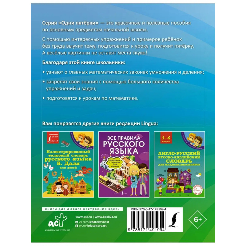 Анна Круглова популярный автор пособий по математике для детей начальных классов. В данной книге представлены базовые законы умножения и деления, материал отобран в соответствии с актуальной образовательной программой и требованиями ФГОС. Ко всем правилам приводятся примеры с иллюстрациями, а многочисленные эффективные упражнения и задачи помогут закрепить пройденный материал. Книга предназначена для учащихся 1-4 классов, но также будет полезна родителям и учителям математики.