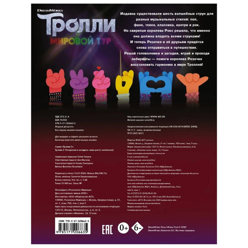 Характеристики Тролли 2. Раскраски и загадки в стиле рок (с наклейками).