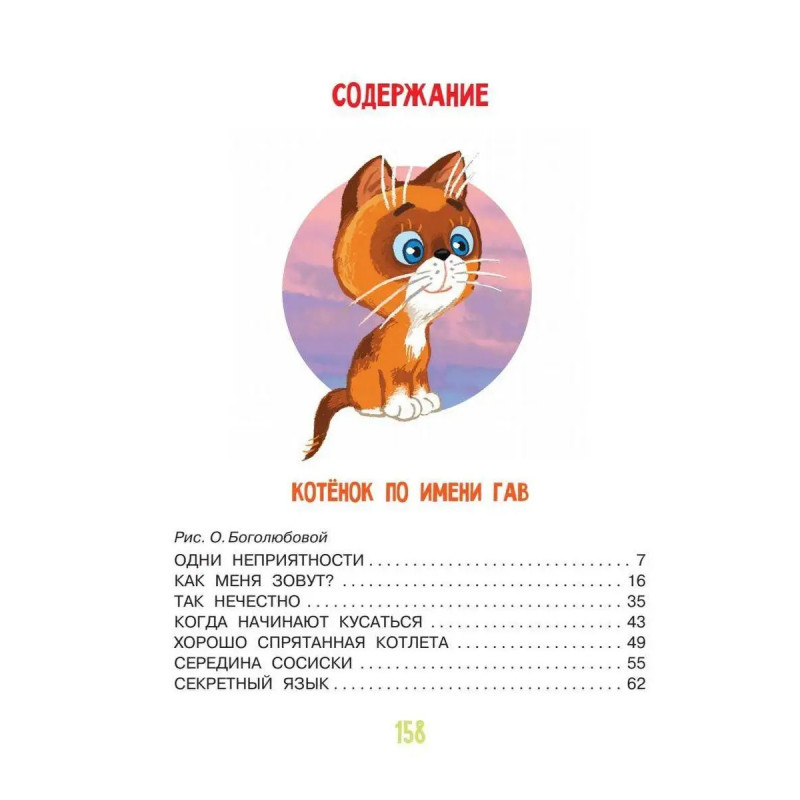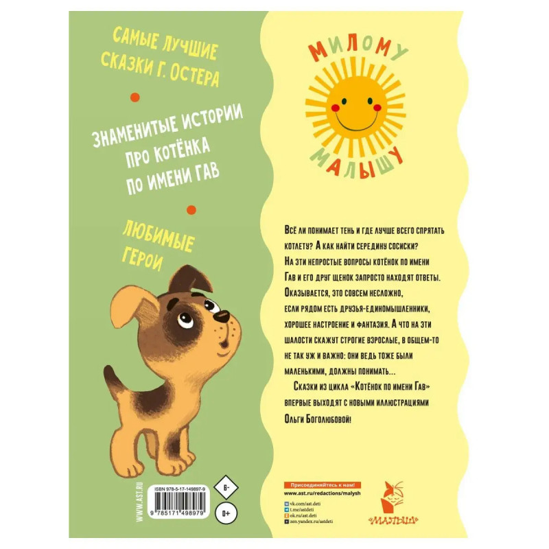 Всё ли понимает тень и где лучше всего спрятать котлету? А как найти середину сосиски? На эти непростые вопросы котёнок по имени Гав и его друг щенок запросто находят ответы. Оказывается, это совсем несложно, если рядом есть друзья-единомышленники, хорошее настроение и фантазия. А что на эти шалости скажут строгие взрослые, в общем-то не так уж и важно: они ведь тоже были маленькими, должны понимать Сказки из цикла Котёнок по имени Гав впервые выходят с новыми иллюстрациями Ольги Боголюбовой!