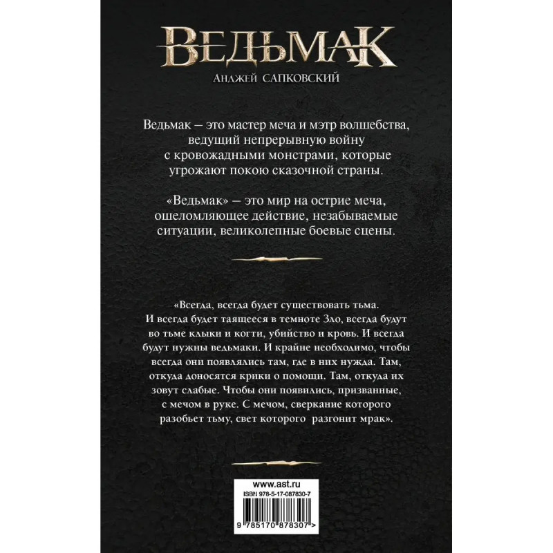 "Всегда, всегда будет существовать тьма. И всегда будет таящееся в темноте Зло, всегда будут во тьме клыки и когти, убийство и кровь. И всегда будут нужны ведьмаки. И крайне необходимо, чтобы они появлялись там, где в них нужда. Там, откуда доносятся крики о помощи. Там, откуда их зовут слабые. Чтобы они появились, призванные, с мечом в руке. С мечом, сверкание которого разобьет тьму, свет которого разгонит мрак".