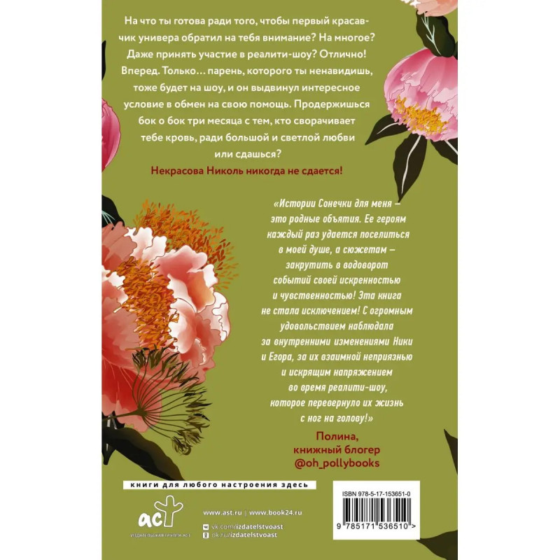 На что ты готова ради того, чтобы первый красавчик универа обратил на тебя внимание? На многое? Даже принять участие в реалити-шоу? Отлично! Вперед. Только парень, которого ты ненавидишь, тоже будет на шоу, и он выдвинул интересное условие в обмен на свою помощь. Продержишься бок о бок три месяца с тем, кто сворачивает тебе кровь, ради большой и светлой любви, или сдашься? Некрасова Николь никогда не сдается!