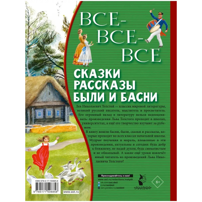 Лев Николаевич Толстой классик мировой литературы, великий русский писатель, мыслитель и просветитель. Его огромный вклад в литературу нельзя недооценивать: произведения Льва Толстого проходят в школах, университетах, а ещё его творчество изучают за рубежом. В книгу вошли басни, были, сказки и рассказы, которые проходят во всех классах начальной школы. Мудрые поучения и мораль, вложенные в эти произведения, актуальны и сегодня: будь добр к ближнему, не падай духом, будь смекалистым и не обманывай. А какие ещё уроки извлечёт юный читатель из произведений Льва Николаевича Толстого?