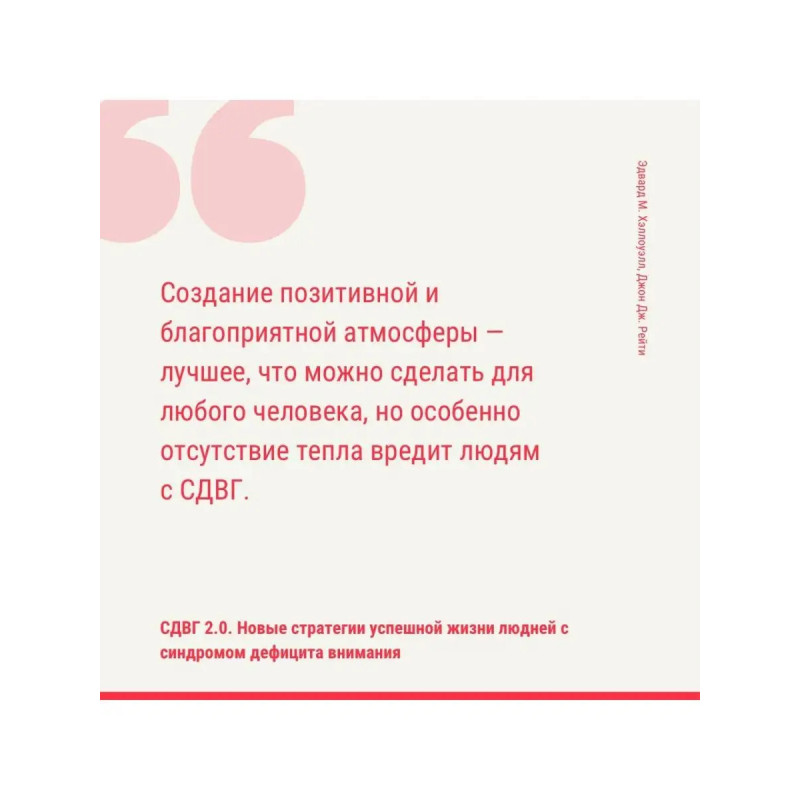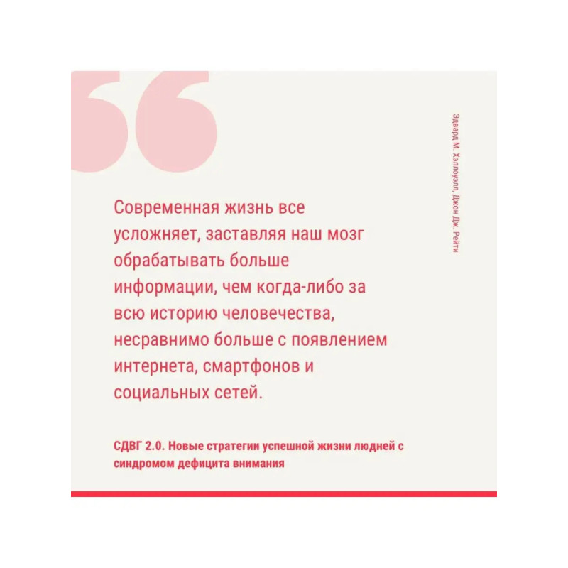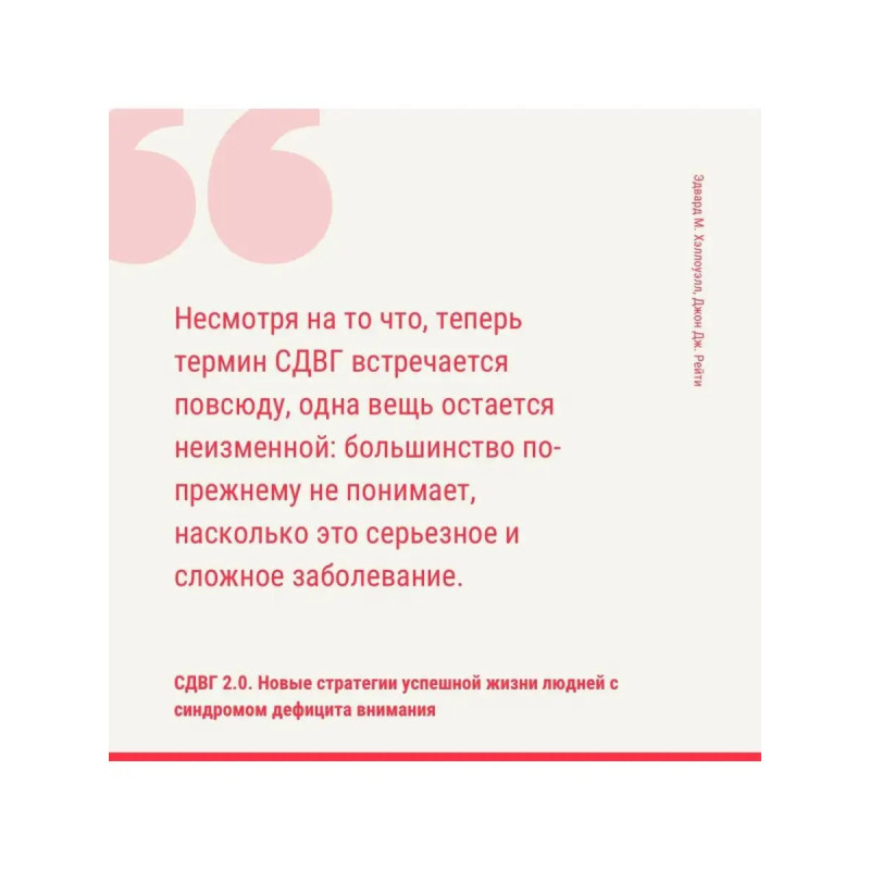 СДВГ 2.. Новые стратегии успешной жизни людей с синдромом дефицита внимания книга, которая адресована тем, кто хотя бы раз задумывался Возможно, у меня СДВГ?, тем, кто знает о своем синдроме, а также родителям, партнерам и близким людей с СДВГ. Книга будет интересна врачам, психологам и педагогам, работающим как с детьми, так и со взрослыми с синдромом дефицита внимания. Примечательно, что авторы книги знаменитые американские психиатры Эдвард М. Хэллоуэлл и Джон Дж. Рейти сами живут с СДВГ и знают о недуге не понаслышке. Читатели узнают данные новейших научных исследований, получат необходимую информацию о том, как работает наш мозг, как устроены виды медикаментозного лечения и психотерапии, а также практические рекомендации.
