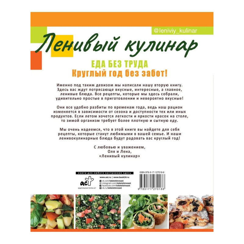 Круглый год без хлопот! Именно под таким девизом мы написали нашу вторую книгу. Здесь вас ждут потрясающе вкусные, интересные, а главное ленивые блюда. Все рецепты, которые мы здесь собрали, удивительно простые в приготовлении и невероятно вкусные! Они все удобно разбиты по временам года, ведь наш рацион изменяется в зависимости от сезона и доступности тех или иных продуктов.Если летом хочется легкости и яркости красок на столе, то зимой организм требует более плотную и сытную еду. Мы очень надеемся, что в этой книге вы найдете для себя рецепты, которые станут любимыми в вашей семье. И наши ленивокулинарные блюда будут радовать вас круглый год! С любовью и уважением, Оля и Лена, Ленивый кулинар