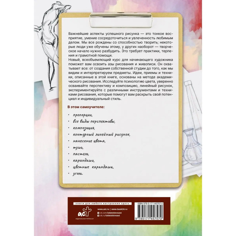 Важнейшие аспекты успешного рисунка это тонкое восприятие, умение сосредоточиться и увлеченность любимым делом. Мы все рождены со способностью творить; некоторые люди уже обучены этому, у других наоборот творческое начало нужно разбудить. Это требует практики, терпения и грамотной помощи. Новый, всеобъемлющий курс для начинающего художника поможет вам начать творить. Он охватывает все: от создания собственной студии до того, как мы видим и интерпретируем предметы. Идеи, приемы и техники, описанные в этой книге, основаны на методе академического рисования. Исследуйте психологию цвета, уверенно осваивайте перспективу и композицию, линейный рисунок, экспериментируйте с различными инструментами и техниками и рисования, которые помогут вам раскрыть свой потенциал и индивидуальный стиль. В этом самоучителе: пропорции, все виды перспективы, композиция, контурный линейный рисунок, нанесение цвета, тушь, пастель, карандаши, цветные карандаши, уголь.