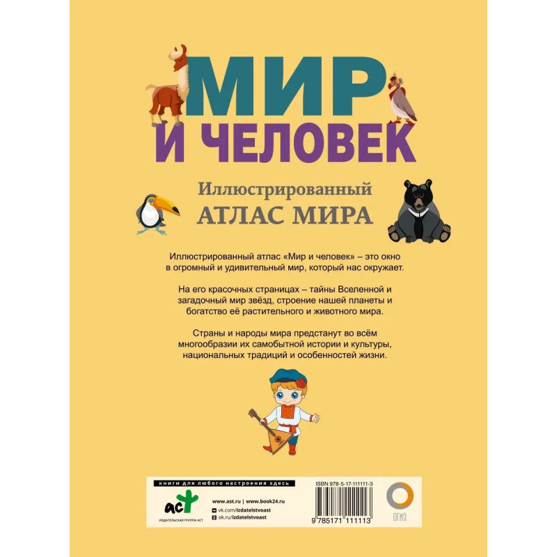 Иллюстрированный атлас МИР И ЧЕЛОВЕК это распахнутое окно в огромный и удивительный мир, который нас окружает. На его красочных страницах тайны Вселенной и загадочный мир звёзд, строение нашей планеты и богатство её растительного и животного мира, Великие географические открытия и современные жители Земного шара. Страны и народы мира представлены во всем многообразии их богатой истории и культуры, национальных традиций и особенностей жизни. Широкий охват тем, доступность изложения, наглядность материалов атласа призваны стимулировать интерес юных читателей к познанию мира.