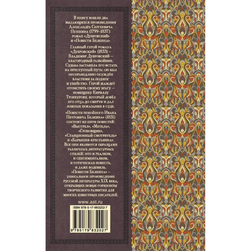 В книгу вошли два выдающихся произведения Александра Сергеевича Пушкина (1799 - 1837): роман Дубровский и Повести Белкина. Главный герой романа Дубровский (1841) - Владимир Дубровский - благородный разбойник. Судьба заставила его встать на преступный путь: он был несправедливо осуждён властями за поджог и убийство. Дубровский жаждет отомстить своему врагу, сумасбродному помещику Кириллу Троекурову, который довёл его отца до смерти и дал ложные показания против Дубровского в суде. Владимир нанимается в дом Троекурова под видом гувернёра. Однако его планам не суждено сбыться: неожиданно он влюбляется в дочь Троекурова - Машу Повести покойного Ивана Петровича Белкина (1831) состоят из 5 повестей: Выстрел, Метель, Гробовщик, Станционный смотритель и Барышня-крестьянка. Все они являются образцами различных литературных стилей: это и реализм, и сентиментализм, и готическая повесть, и даже водевиль. Повести Белкина - уникальное произведение русской литературы XIX века, открывшее новые горизонты