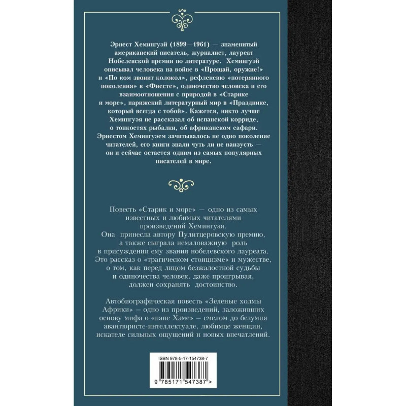 Повесть "Старик и море" одно из самых известных и любимых читателями произведений Хемингуэя. Она принесла автору Пулитцеровскую премию, а также сыграла немаловажную роль в присуждении ему звания нобелевского лауреата. Это рассказ о "трагическом стоицизме" и мужестве, о том, как перед лицом безжалостной судьбы и одиночества человек, даже проигрывая, должен сохранять достоинство. Автобиографическая повесть "Зеленые холмы Африки" одно из произведений, заложивших основу мифа о "папе Хэме" смелом до безумия авантюристе-интеллектуале, любимце женщин, искателе сильных ощущений и новых впечатлений.
