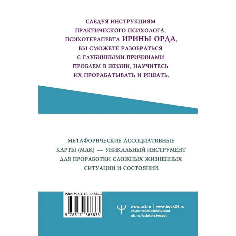 Метафорические ассоциативные карты (МАК) уникальный инструмент для проработки сложных жизненных ситуаций и состояний. Эта книга поможет освоить работу с МАК, чтобы решить значимые для вас проблемные ситуации, снять тревожность, устранить конфликты, как внутренние, так и внешние, получить доступ к скрытым ресурсам вашего подсознания. Следуя инструкциям практического психолога, психотерапевта Ирины Орда вы сможете разобраться с глубинными причинами проблем в жизни, научитесь их прорабатывать и решать.