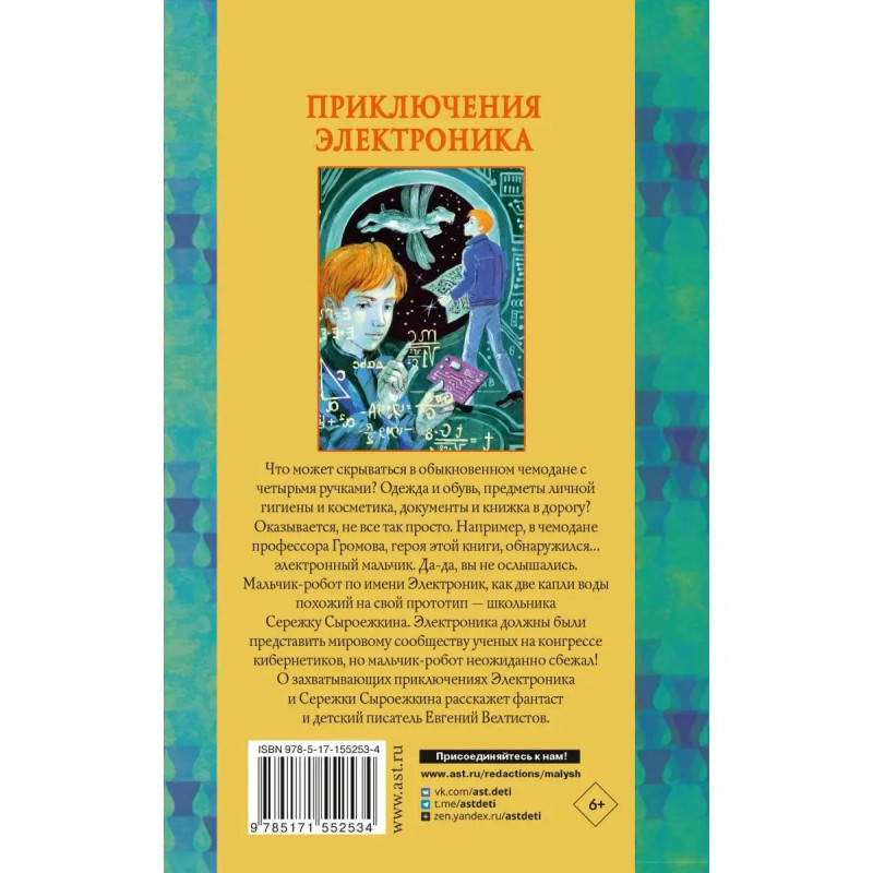 Что может скрываться в обыкновенном чемодане с четырьмя ручками? Одежда и обувь, предметы личной гигиены и косметика, документы и книжка в дорогу? Оказывается, не всё так просто. Например, в чемодане профессора Громова, героя этой книги, обнаружился электронный мальчик. Да-да, вы не ослышались. Мальчик-робот по имени Электроник, как две капли воды похожий на свой прототип школьника Серёжку Сыроежкина. Электроника должны были представить мировому сообществу учёных на конгрессе кибернетиков, но мальчик-робот неожиданно сбежал! О захватывающих приключениях Электроника и Серёжки Сыроежкина расскажет фантаст и детский писатель Евгений Велтистов.