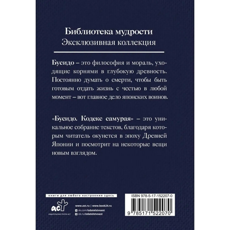 Бусидо это философия и мораль, уходящая корнями в глубокую древность. Содержащий в себе свод постулатов, наравне со всесторонним образованием, кодекс требовал от самурая безупречного исполнения долга, а также выдающихся способностей и непрестанное усердие для самосовершенствования. Постоянно думать о смерти, чтобы быть готовым отдать жизнь с честью в любой момент вот главное дело японских воинов. Однако эта идеология была нацелена не только на них в отсутствие мужа женщины становились защитницами своего дома от чужаков и даже участвовали в реальных сражениях. Бусидо. Кодекс воина - это уникальное собрание текстов, благодаря которым читатель окунется в эпоху Древней Японии и посмотрит на некоторые вещи новым взглядом.