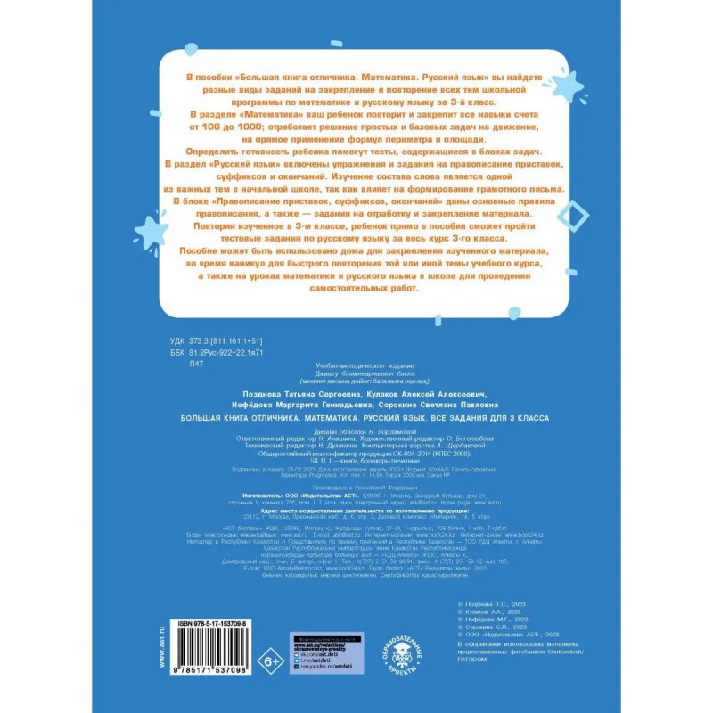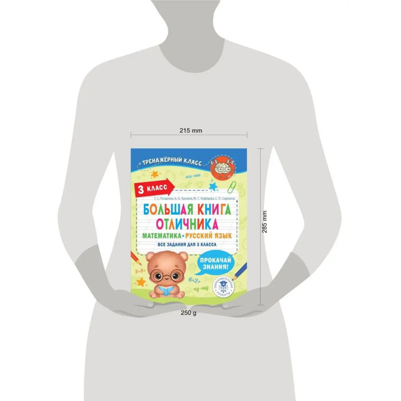 В пособии "Большая книга отличника. Математика. Русский язык" вы найдете разные виды заданий на закрепление и повторение всех тем школьной программы по математике и русскому языку за 3-й класс. В разделе "Математика" ваш ребенок повторит и закрепит все навыки счета от 1 до 1; отработает решение простых и базовых задач на движение, на прямое применение формул периметра и площади. Определить готовность ребенка помогут тесты, содержащиеся в блоках задач. В разделе "Русский язык" включены упражнения и задания на правописание приставок, суффиксов и окончаний. Изучение состава слова является одной из важных тем в начальной школе, так как влияет на формирование грамотного письма. В блоке "Правописание приставок, суффиксов, окончаний" даны основные правила правописания, а также задания на отработку и закрепление материала. Повторяя изученное в 3-м классе, ребенок прямо в пособии сможет пройти тестовые задания по русскому языку за весь курс 3-го класса. Пособие может быть использовано дома для закрепления изученного