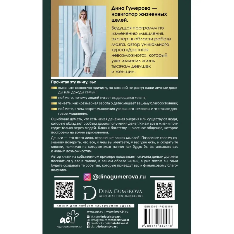 Дина Гумерова ведущая программ по изменению мышления, эксперт в области работы мозга, автор уникального курса Достигая невозможного, который уже изменил жизнь тысячам девушек и женщин. Автор бестселлера Нейроны счастливых отношений. Достигая невозможного (АСТ, 219). Прочитав эту книгу, вы: выясните основную причину, по которой не растут ваши личные доходы или доходы семьи; поймете, почему людей пугает выдающаяся жизнь; узнаете, как чрезмерная забота о детях мешает вашему благосостоянию; осознаете разницу между целью и процессом создания желаемых доходов; поймете, в чем секрет мышления успешного человека и что такое долговое мышление.