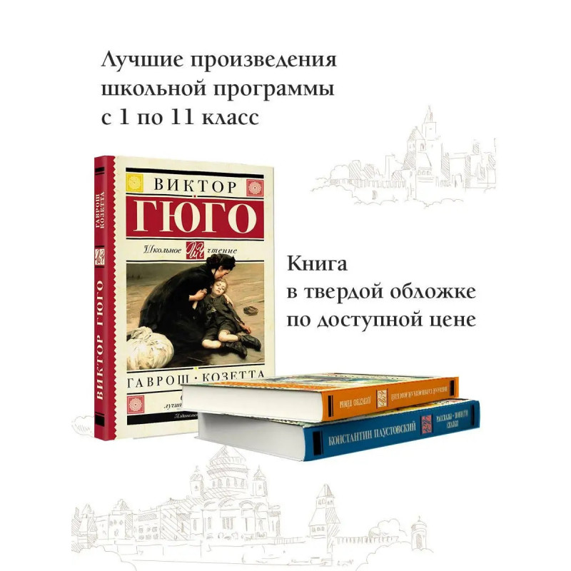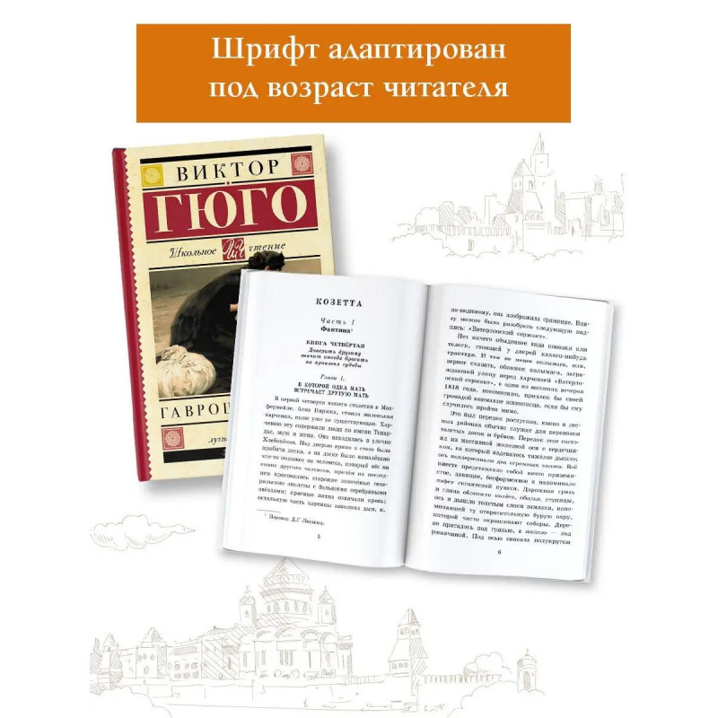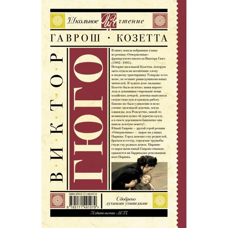 В книгу вошли избранные главы из романа Отверженные французского писателя Виктора Гюго (1821885). История маленькой Козетты, которую мать отдала на воспитание злому и жадному трактирщику Тенардье и его жене, не оставит равнодушными юных читателей. В чужом доме малышке Козетте было нелегко: живя впроголодь и донашивая старенькие вещи хозяйских дочерей, девочка выполняла самую тяжелую и грязную работу. Каково же было удивление и недоумение маленькой девочки, когда однажды, под Рождество, какой-то незнакомец купил ей дорогую куклу, а в своём деревянном башмачке, она нашла золотую монету!.. Юный Гаврош другой герой романа Отверженные вырос на улицах Парижа. Город заменил ему родителей, братьев и сестер, городские трущобы стали ему родным домом. Наравне со взрослыми юный Гаврош отважно сражается на баррикадах революционного Парижа. Главы романа, вошедшие в книгу, входят в программу для обязательного чтения в начальной ьшколе.
