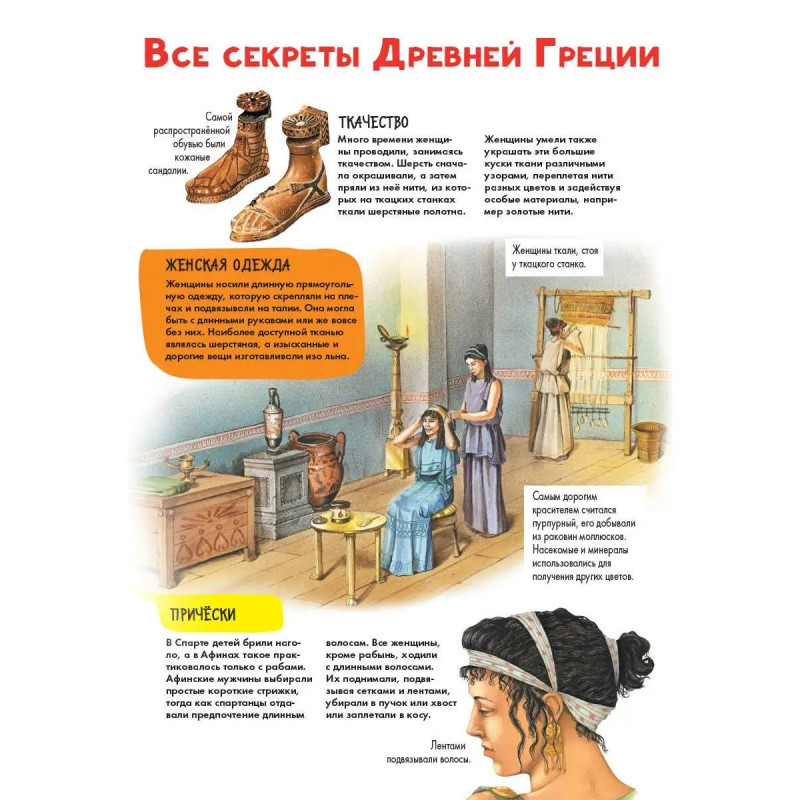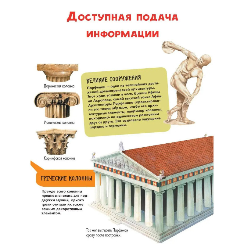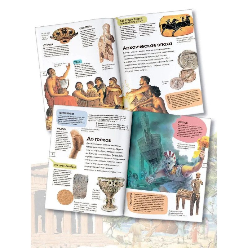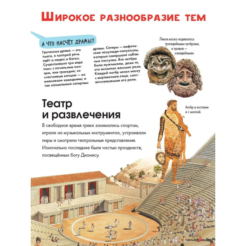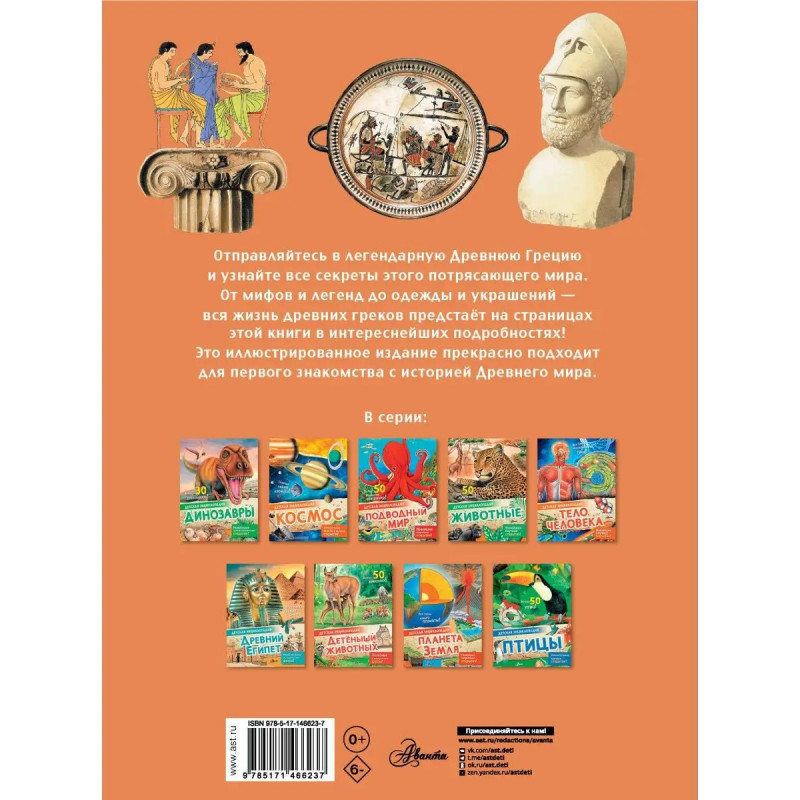 Откройте все секреты Древнего Мира! Вашего ребёнка ждёт увлекательнейшее путешествие в прошлое: он узнает о том, во что верили древние греки, как одевались, какие здания строили. Что такое полис? Сколько было олимпийских богов? Как выглядел древнегреческий театр? Книга прекрасно подойдет для первого знакомства с миром Древней Греции, его культурой, историей, традициями. Лоредана Агоста и Энн МакРей, авторы множества научно-популярных книг для детей, просто и увлекательно рассказывают о сложных вещах, делятся самыми интересными и необычными фактами и не дают читателю скучать. А яркие иллюстрации делают каждую страницу ещё более занимательной. Отправляйтесь на увлекательную экскурсию в прошлое!