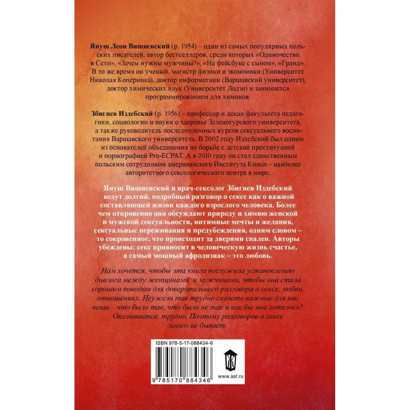 Януш Вишневский и врач-сексолог Збигнев Издебский ведут долгий, подробный разговор о сексе как о важной составляющей жизни каждого взрослого человека. Более чем откровенно они обсуждают природу и химию женской и мужской сексуальности, интимные мечты и желания, сексуальные переживания и предубеждения, одним словом то сокровенное, что происходит за дверями спален. Авторы убеждены: секс привносит в человеческую жизнь счастье, а самый мощный афродизиак это любовь.