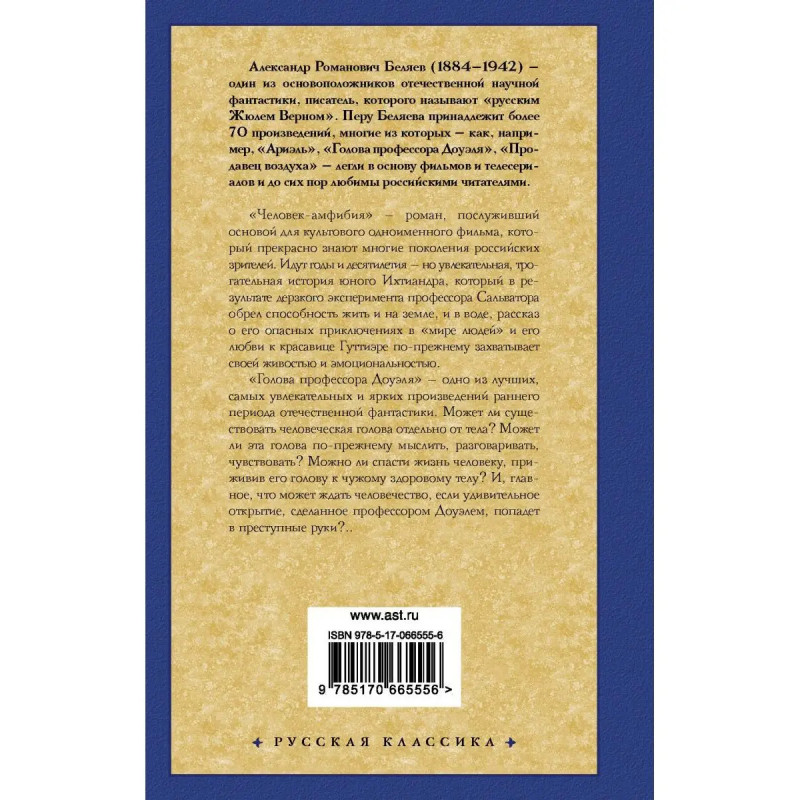Роман "Человек-амфибия", послуживший основой для культового одноименного фильма, прекрасно знают многие поколения читателей и зрителей. Идут годы и десятилетия, но увлекательная, трогательная в своем драматизме история юного Ихтиандра, который в результате дерзкого эксперимента профессора Сальватора обрел способность жить и на земле, и в воде, рассказ о его опасных приключениях в "мире людей" и его любви к красавице Гуттиэре, по-прежнему захватывает своей живостью и эмоциональностью. "Голова профессора Доуэля". Одно из лучших, самых увлекательных и ярких произведений раннего периода отечественной фантастики, экранизированное в 1984 году под названием "Завещание профессора Доуэля". Может ли существовать человеческая голова отдельно от тела? Может ли эта голова по-прежнему мыслить, разговаривать, чувствовать? Можно ли спасти жизнь человеку, приживив его голову к чужому, здоровому телу? И, главное, что может ждать человечество, если удивительное открытие, сделанное профессором Доуэлем попадет в преступные руки?
