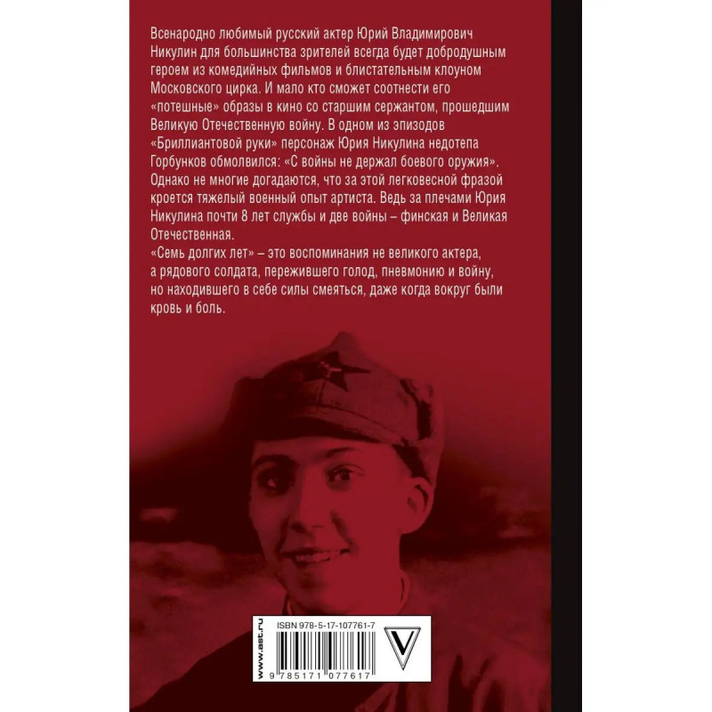Всенародно любимый русский актер Юрий Владимирович Никулин для большинства зрителей всегда будет добродушным героем из комедийных фильмов и блистательным клоуном Московского Цирка. И мало кто сможет соотнести его "потешные" образы в кино со старшим сержантом, прошедшим Великую Отечественную войну. В одном из эпизодов "Бриллиантовой руки" персонаж Юрия Никулина недотепа-Горбунков обмолвился: "С войны не держал боевого оружия". Однако не многие догадаются, что за этой легковесной фразой кроется тяжелый военный опыт артиста. Ведь за плечами Юрия Никулина - почти 8 лет службы, и две войны - Финская и Великая Отечественная. "Семь долгих лет" это воспоминания не великого актера, а рядового солдата, пережившего голод, пневмонию и войну, но находившего в себе силы смеяться даже когда вокруг были кровь и боль.