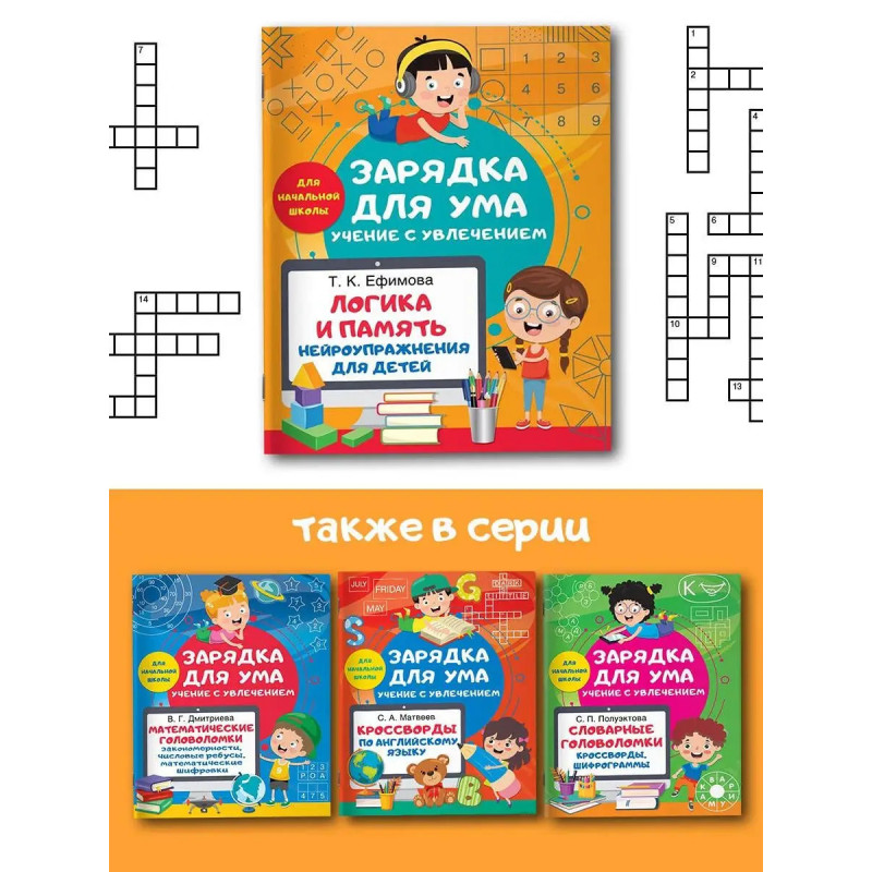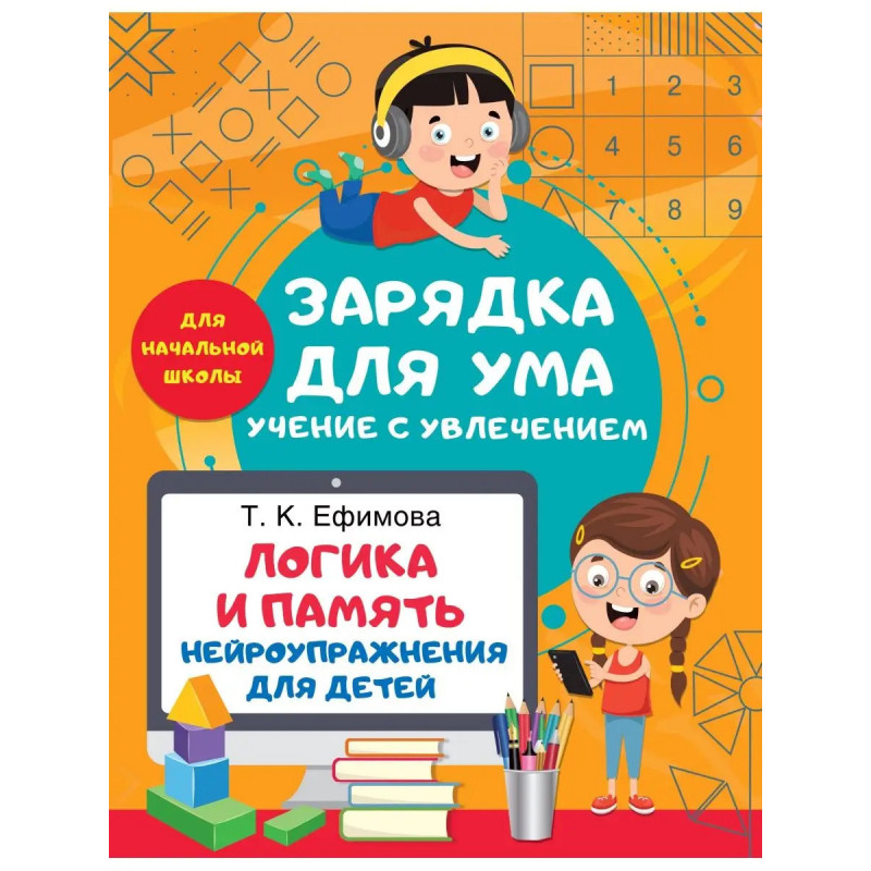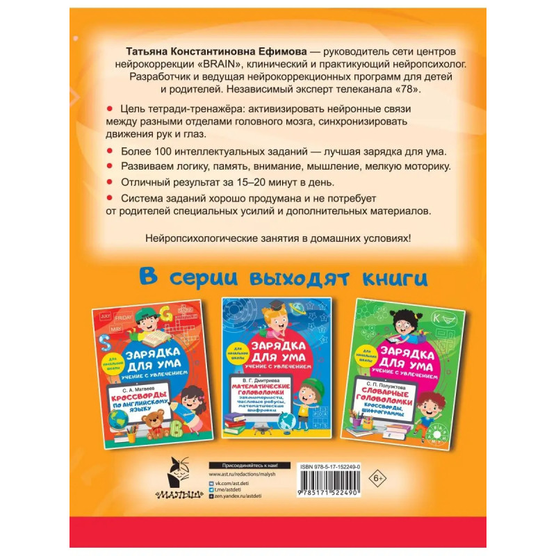 Серия Зарядка для ума: учение с увлечением методически выстроенная система интеллектуального развития ребенка. Книга Логика и память. Нейроупражнения для детей создана по авторской методике Т. К. Ефимовой руководителя сети центров нейрокоррекции BRAIN, клинического и практикующего нейропсихолога, разработчика и ведущей нейрокоррекционных программ для детей и родителей, автора более 1 публикаций, посвящённых актуальным вопросам нейро-педагогики. Авторский курс нейропсихологических упражнений игры и задания, которые рассчитаны на развитие разных областей мозга ребёнка. дошкольники научатся концентрировать внимание на конкретном задании; потренируют мышление, логику, память; регулярные занятия позволят справиться с проблемами в обучении.