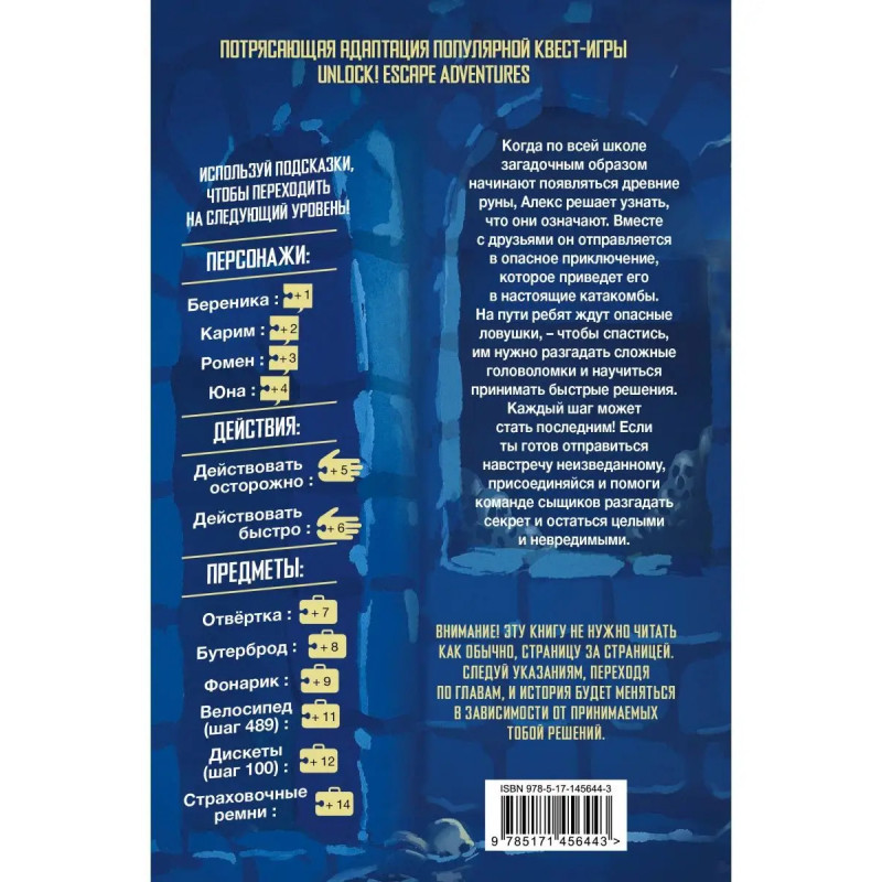 Квестбук по французской игре Unlock! Escape Adventures. Пятеро отважных школьников разгадывают тайны рун и секреты древнего ордена. Увлекательные приключения начинаются с первой страницы, а главный герой ты сам! Выполняй задания, разгадывай головоломки и следуй по непредсказуемому маршруту, задуманному как таинственное путешествие к истокам невероятных сокровищ. Понравится мальчикам и девочкам в возрасте от 8 до 14 лет.