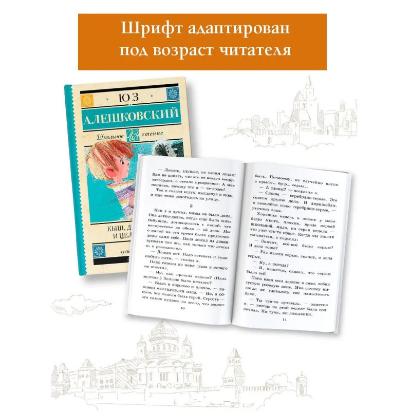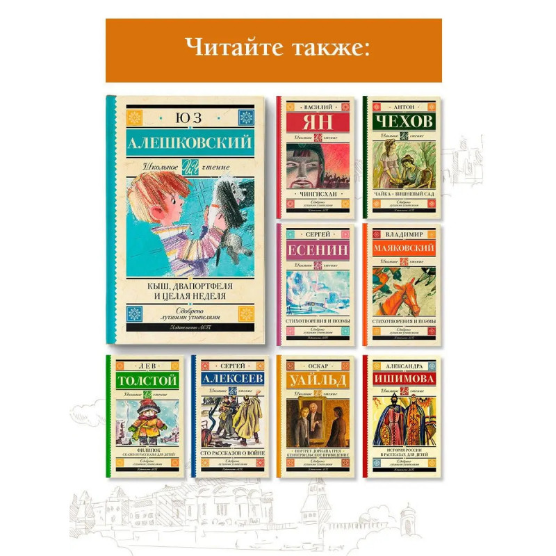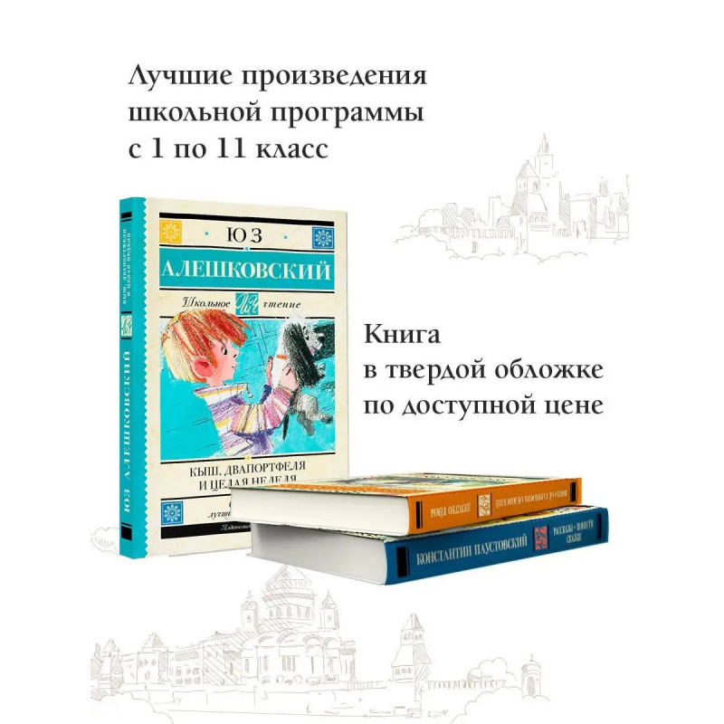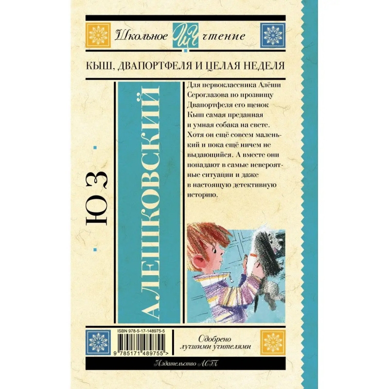 Знаменитая детская повесть Юза Алешковского! Кыш, Двапортфеля и целая неделя повесть для ребят, умеющих ценить настоящую дружбу и совершающих во имя неё самые настоящие подвиги. Она рассказывает о дружбе первоклассника Алёши Сероглазова и его щенка Кыша. Книга написана с большой любовью к детям и братьям нашим меньшим. Поэтому Кыш получился таким живым, а Алёша верным товарищем, способным на удивительные поступки. В серию включены лучшие произведения отечественной и зарубежной литературы, входящие в школьную программу с 1 по 11 класс и в списки дошкольного чтения. Книги в твердом переплете сделают знакомство с литературой легким и увлекательным. Серия, которая не ударит по семейному бюджету и поможет юному читателю расти нравственно и интеллектуально!