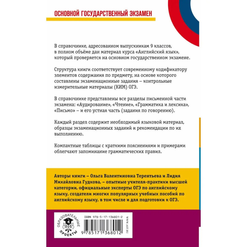 В справочнике, адресованном выпускникам 9 классов, в полном объеме дан материал курса "Английский язык", который проверяется на основном государственном экзамене. Структура книги соответствует современному кодификатору элементов содержания по предмету, на основе которого составлены экзаменационные задания контрольные измерительные материалы (КИМ) ОГЭ. В справочнике представлены все разделы письменной части экзамена: "Аудирование", "Чтение", "Грамматика и лексика", "Письмо" - и его устная часть (задания по говорению в новом формате). Каждый раздел содержит необходимый языковой материал, образцы экзаменационных заданий и рекомендации по их выполнению. Компактные таблицы с краткими пояснениями и примерами облегчают запоминание грамматических правил.