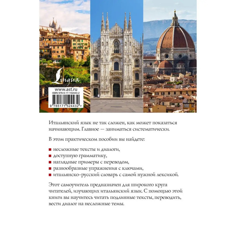 Петрова Людмила Александровна кандидат филологических наук, преподаватель с огромным опытом работы в ведущих вузах страны, крупнейший современный итальянист; профессиональный переводчик, автор известных пособий по изучению итальянского языка. Самоучитель состоит из 57 уроков. Содержит несложные тексты и диалоги, доступную грамматику, наглядные примеры с переводом, разнообразные упражнения с ключами, итальянско-русский словарь (около 15 слов). Также эта книга познакомит вас с жизнью современных итальянцев, с их традициями и культурой. Вы узнаете о знаменитой итальянской кухне, об атмосферных городах Италии и их уникальных достопримечательностях. Этот самоучитель предназначен для широкого круга читателей, изучающих итальянский язык. С помощью этой книги вы сможете приобрести знания уровней A1A2: научитесь читать подлинные тексты, переводить, вести диалог на несложные темы.