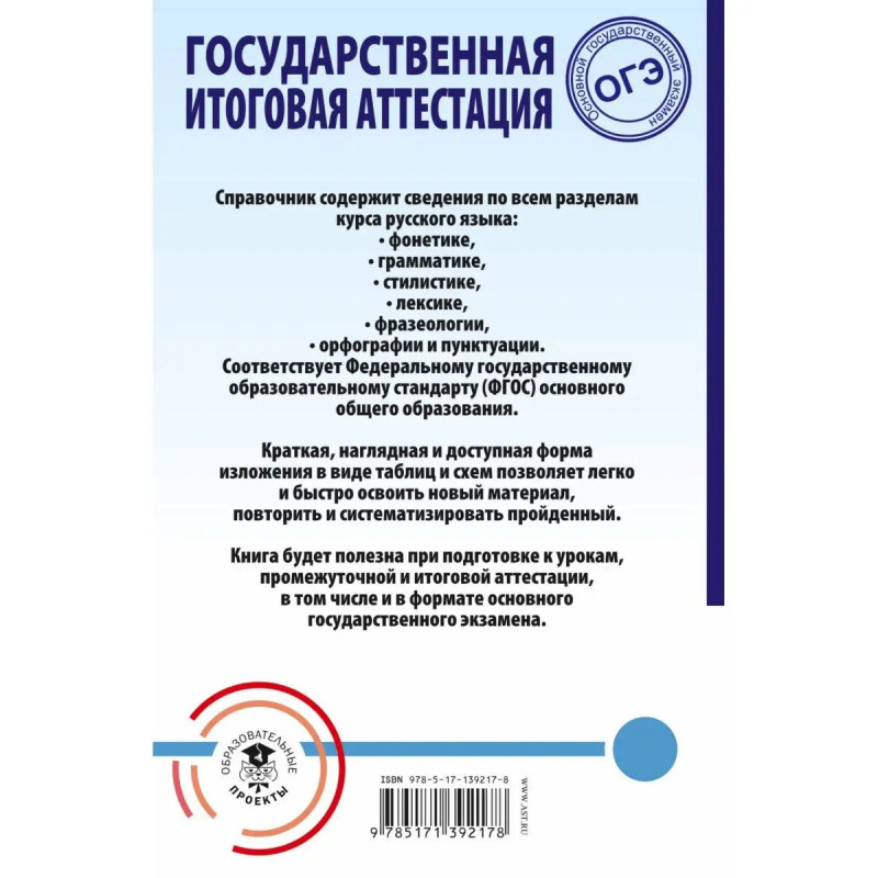 Справочник содержит сведения по всем разделам курса русского языка: фонетике, грамматике, стилистике, лексике, фразеологии, орфографии и пунктуации и соответствует Федеральному государственному образовательному стандарту (ФГОС) основного общего образования. Краткая, наглядная и доступная форма изложения в виде таблиц и схем позволяет легко и быстро освоить новый материал, повторить и систематизировать пройденный. Книга будет полезна при подготовке к урокам, промежуточной и итоговой аттестации, в том числе и в формате основного государственного экзамена.