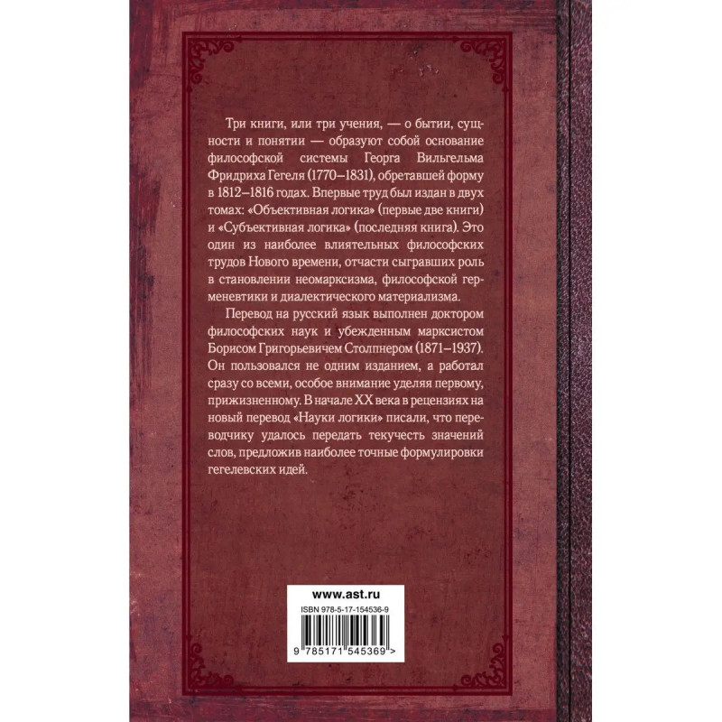 Три книги, или три учения о бытии, сущности и понятии, образуют собой основание философской системы Георга Вильгельма Фридриха Гегеля (1771831), обретавшей форму в 18121816 годах. Впервые труд был издан в двух томах: "Объективная логика" (первые две книги) и "Субъективная логика" (последняя книга). Это один из наиболее влиятельных философских трудов Нового времени, отчасти сыгравших роль в становлении неомарксизма, философской герменевтики и диалектического материализма. Перевод на русский язык выполнен доктором философских наук и убежденным марксистом Борисом Григорьевичем Столпнером (18711937). Он пользовался не одним изданием, а работал сразу со всеми, особое внимание уделяя первому прижизненному. В начале XX века в рецензиях на новый перевод "Науки логики" писали, что переводчику удалось передать текучесть значений слов, предложив наиболее точные формулировки гегелевских идей.