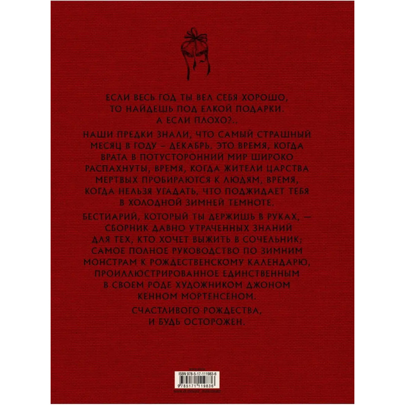 Если весь год ты вел себя хорошо, то найдешь под елкой подарки. А если пл.оxо?.. Наши предки знали, что самый страшный месяц в году декабрь. Это время, когда врата в потусторонний мир широко распахнуты, время, когда жители царства мертвых пробираются к людям, время, когда нельзя угадать, что поджидает тебя в холодной зимней темноте. Бестиарий, который ты держишь в руках, сборник давно утраченных знаний для тех, кто хочет выжить в сочельник; самое полное руководство по зимним монстрам к рождественскому календарю, проиллюстрированное единственным в своем роде художником Джоном Кенном Мортенсеном. Счастливого Рождества, и будь осторожен.