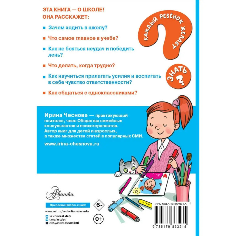 Новая книга серии Каждый ребенок желает знать Как ходить в школу с удовольствием для младших и средних школьников, а также их родителей. Текст украшают и дополняют замечательные современные и веселые рисунки художника Муси Кудрявцевой. Эта книга - о школе! Она расскажет: - Зачем ходить в школу? - Что самое главное в учебе? - Как не бояться неудач и победить лень? - Что делать, когда трудно? - Как научиться прилагать усилия и воспитать в себе чувство ответственности? - Как общаться с одноклассниками?