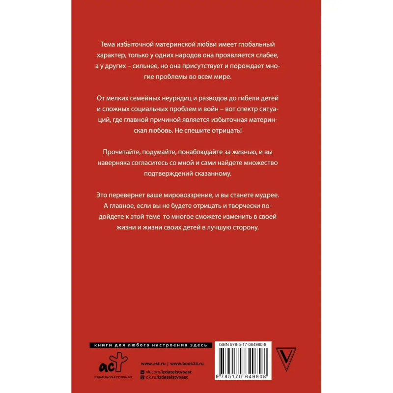 Эта книга исследует необычную тему материнскую любовь. Подумайте: что здесь необычного? Рассматривается та сторона материнской любви, которая исподволь приносит множество страданий и горя родителям, детям и обществу в целом. Исследований такой глубины на эту тему в литературе ещё не было, и каждый читатель найдёт множество полезной информации для применения в своей жизни. Действительно, эта книга адресуется каждой семье!