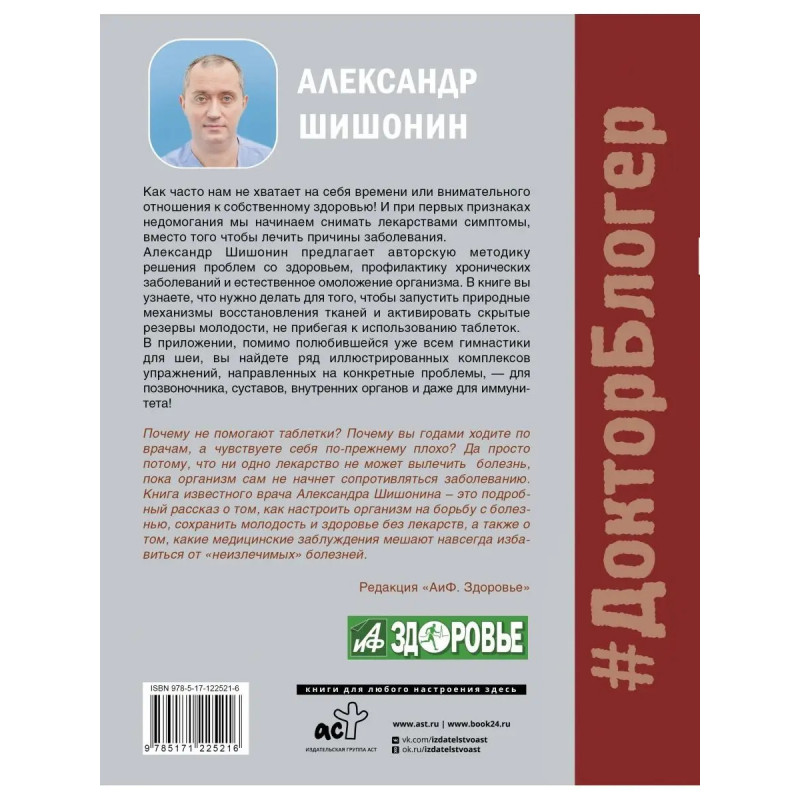 Почему не помогают таблетки? Почему вы годами ходите по врачам, а чувствуете себя по-прежнему пл.оxо? Да просто потому, что ни одно лекарство не может вылечить болезнь, пока организм сам не начнет сопротивляться заболеванию. Книга известного врача Александра Шишонина это подробный рассказ о том, как настроить организм на борьбу с болезнью, сохранить молодость и здоровье без лекарств, а также о том, какие медицинские заблуждения мешают навсегда избавиться от неизлечимых болезней. Редакция АиФ. Здоровье