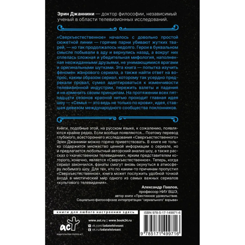 Сверхъестественное: история невероятного путешествия путеводитель по миру одного из самых популярных сериалов в истории телевидения. Вместе с Эрин Джаннини вы узнаете: - как разрабатывалась концепция сериала; - как Сверхъестественному удалось завоевать высочайшие рейтинги и собрать возле экранов многомиллионную аудиторию; - почему одни сериалы выстреливают, в то время как другие проваливаются в прокате.