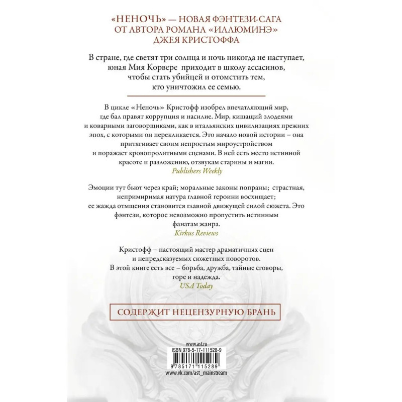 История ассасина Мии Корвере превратилась в международный бестселлер. Жестокий магический мир под тремя солнцами, эротика, тонкое чувство юмора и интриги коррумпированных политиков вот, за что читатели ценят трилогию. Джей Кристофф австралийский писатель, один из соавторов нашумевшего научно-фантастического романа Иллюминэ, снискал мировую славу произведениями в жанре фэнтези и фантастики. Книги Кристоффа не раз становились бестселлерами The New York Times, номинировались на литературные премии и возглавляли читательские рейтинги. В стране, где светят три солнца и ночь никогда не наступает, юная Мия Корвере приходит в школу ассасинов, чтобы стать убийцей и отомстить тем, кто уничтожил её семью. Мия лишилась родных после того, как её отец пытался поднять восстание и потерпел неудачу. Оставшись в одиночестве, без поддержки друзей, она пряталась в городе, построенном из костей мертвого бога. Её преследовали Сенат и бывшие товарищи отца. Однако у девушки есть редкий дар и он открыл для нее двери в будуще