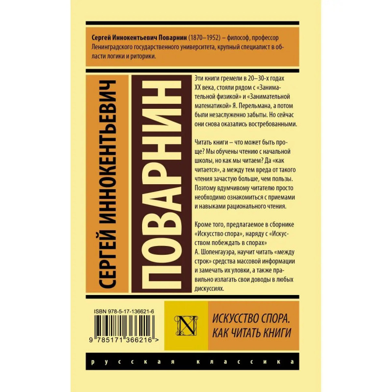 Сергей Иннокентьевич Поварнин (1871952) философ, профессор Ленинградского государственного университета, крупный специалист в области логики и риторики. Эти книги гремели в 23-х годах ХХ века, стояли рядом с "Занимательной физикой" и "Занимательной математикой" Я.Перельмана, а потом были незаслуженно забыты. Но сейчас они снова оказались востребованными. Читать книги что может быть проще? Мы обучены чтению с начальной школы, но как мы читаем? Да "как читается", а между тем вреда от такого чтения зачастую больше, чем пользы. Поэтому вдумчивому читателю просто необходимо ознакомиться с приемами и навыками рационального чтения. Кроме того, предлагаемое в сборнике "Искусство спора", наряду с "Искусством побеждать в спорах" А. Шопенгауэра, научит читать "между строк" средства массовой информации и замечать их уловки, а также правильно излагать свои доводы в любых дискуссиях.
