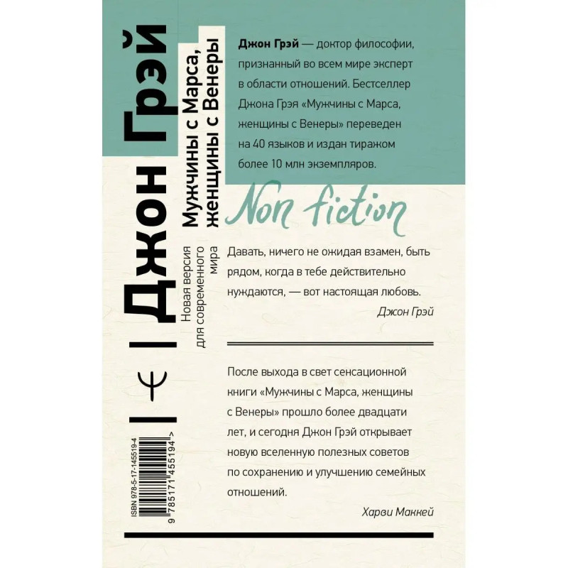 Более 25 лет назад психолог Джон Грэй издал книгу, которая перевернула представления об отношениях между мужчиной и женщиной, "Мужчины с Марса, женщины с Венеры". Эта книга убедительно доказала, что мужчины и женщины мыслят, чувствуют и действуют по-разному. И это была настоящая сенсация! Изучая книгу, сотни тысяч мужчин и женщин по всему миру учились понимать друг друга, становились счастливыми, спасали отношения. Но в XXI веке некоторые советы стали уже не актуальны: мир изменился! То, что было спасением в прошлом веке, сегодня перестало работать. Но все эти годы Джон Грэй продолжал работу с парами, консультировал, внимательно изучал тенденции нового мира. Поэтому появилась принципиально новая версия знаменитой книги, которая объединяет в себе открытия первой книги и новый современный взгляд на отношения. Как именно изменились мужчины и женщины за последние двадцать лет? Какие действия и слова провоцируют конфликты в современной семье? Как сохранять влечение друг к другу на долгие годы? Об этом и мног