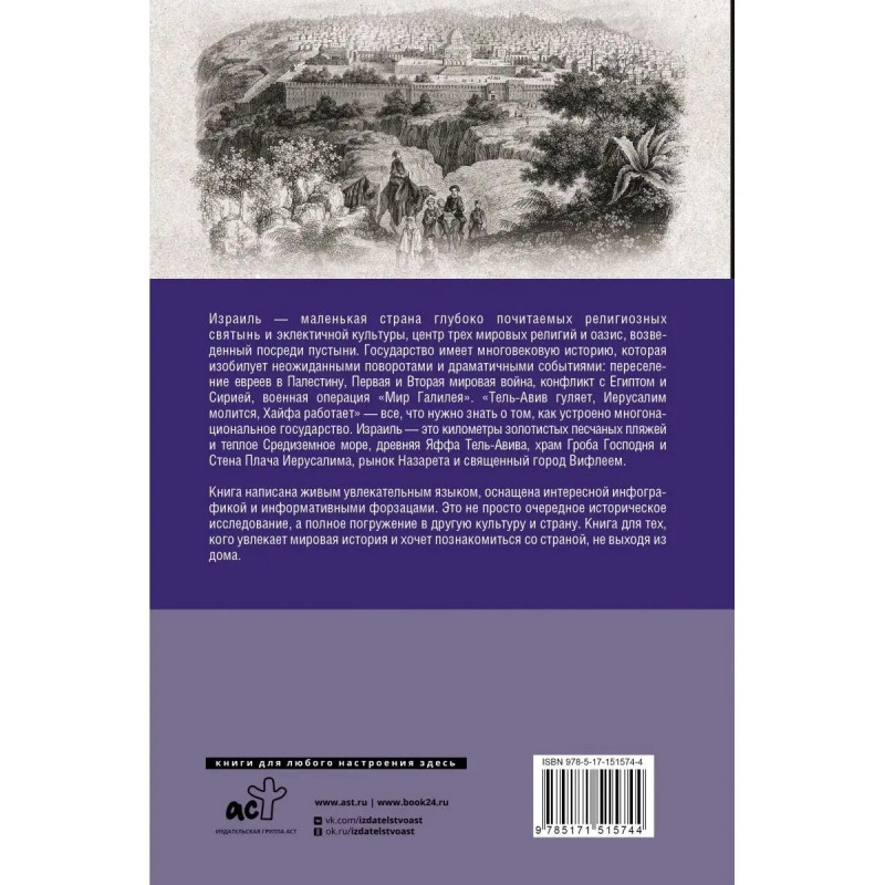 Израиль маленькая страна глубоко почитаемых религиозных святынь и эклектичной культуры, центр трех мировых религий и оазис, возведенный посреди пустыни. Государство имеет многовековую историю, которая изобилует неожиданными поворотами и драматичными событиями: переселение евреев в Палестину, Первая и Вторая мировая война, конфликт с Египтом и Сирией, военная операция "мир Галилея". "Тель-Авив гуляет, Иерусалим молится, Хайфа работает" все, что нужно знать о том, как устроено многонациональное государство. Израиль это километры золотистых песчаных пляжей и теплое Средиземное море, Древняя Яффа Тель-Авива, храм Гроба Господня и Стена Плача Иерусалима, рынок Назарета и священный город Вифлеем. Фишки книги: Инфографика; 2 важнейших событий, подробно и увлекательно рассказанные; 2 выдающихся личностей с фактами, о которых вы еще не знали. Из книги "Израиль. Полная история страны" вы узнаете: С чего начинался Израиль; Почему у Израиля нет конституции; Из-за чего началась Ливанская война. Для к