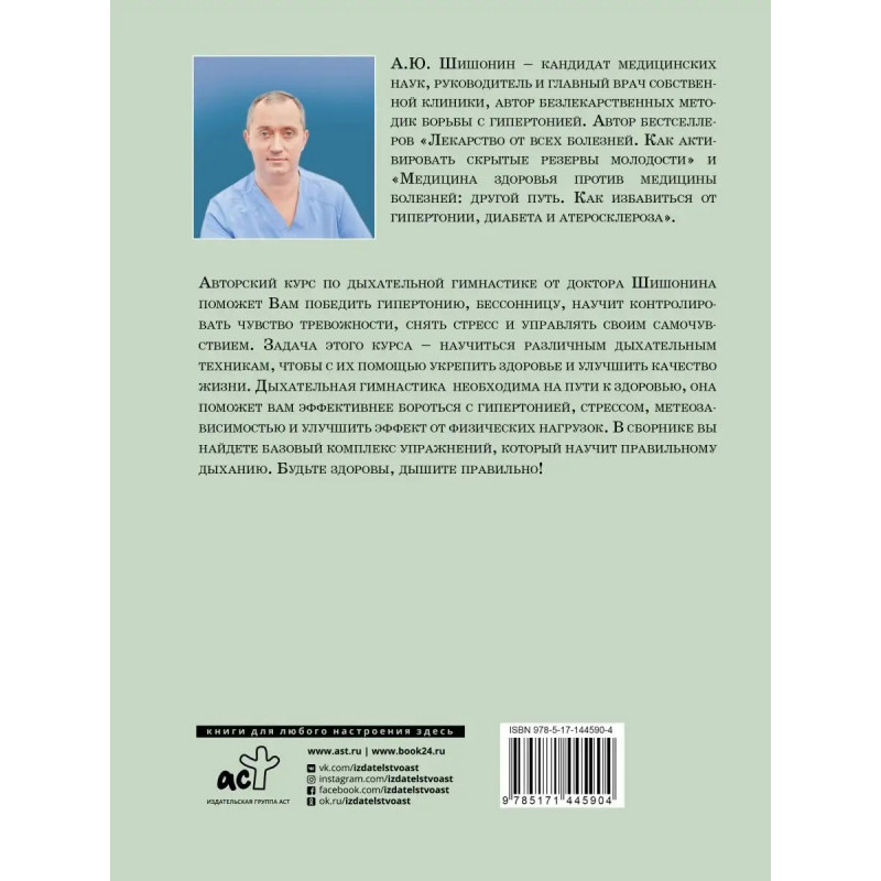 А.Ю. Шишонин кандидат медицинских наук, руководитель и главный врач собственной клиники, автор безлекарственных методик борьбы с гипертонией, действительный член Нью-Йоркской Академии Наук. Автор бестселлеров Лекарство от всех болезней. Как активировать скрытые резервы молодости и Медицина здоровья против медицины болезней: другой путь. Как избавиться от гипертонии, диабета и атеросклероза. Авторский курс по дыхательной гимнастике от доктора Шишонина поможет Вам победить гипертонию, бессонницу, научит контролировать чувство тревожности, снять стресс и управлять своим самочувствием. Задача этого курса научиться различным дыхательным техникам, чтобы с их помощью укрепить здоровье и улучшить качество жизни. Дыхательная гимнастика необходима на пути к здоровью, она поможет вам эффективнее бороться с гипертонией, стрессом, метеозависимостью и улучшить эффект от физических нагрузок. В сборнике вы найдете базовый комплекс упражнений, который научит правильному дыханию. Будьте здоровы, дышите правильно!