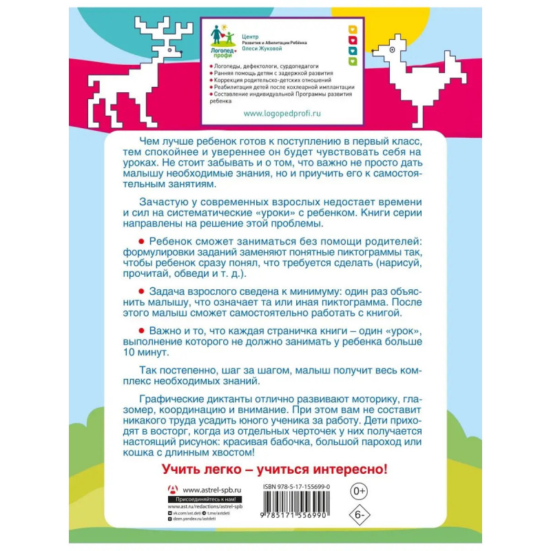 Книги этой серии созданы специально для занятых родителей. Дети вполне смогут заниматься без помощи взрослых: формулировки заданий заменяют понятные пиктограммы так, чтобы ребенок сразу понял, что требуется сделать (нарисуй, раскрась, обведи и т. д.). Такие занятия приучают малыша к самостоятельному выполнению заданий, что является важнейшим навыком для будущего первоклассника. Графические диктанты отлично развивают моторику, глазомер, координацию и внимание. При этом вам не составит никакого труда усадить юного ученика за работу. Дети приходят в восторг, когда из отдельных черточек у них получается настоящий рисунок: красивая бабочка, большой пароход или кошка с длинным хвостом. Для дошкольного возраста.
