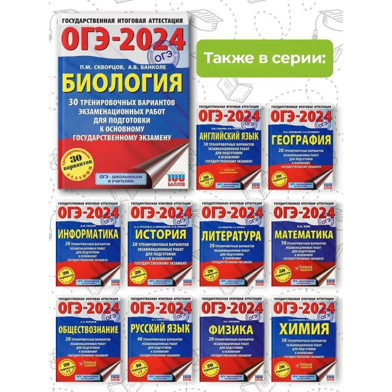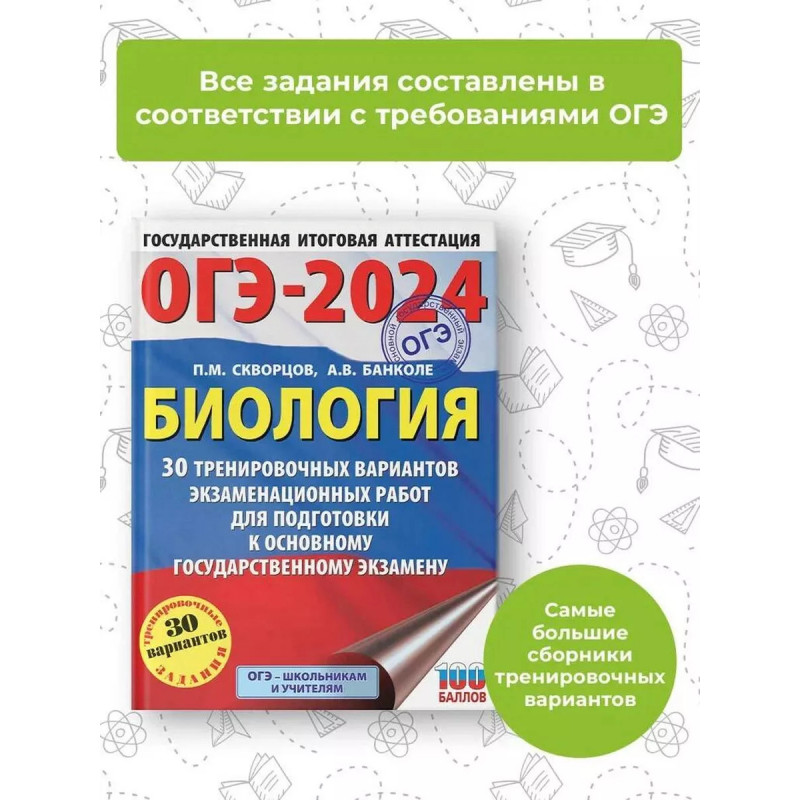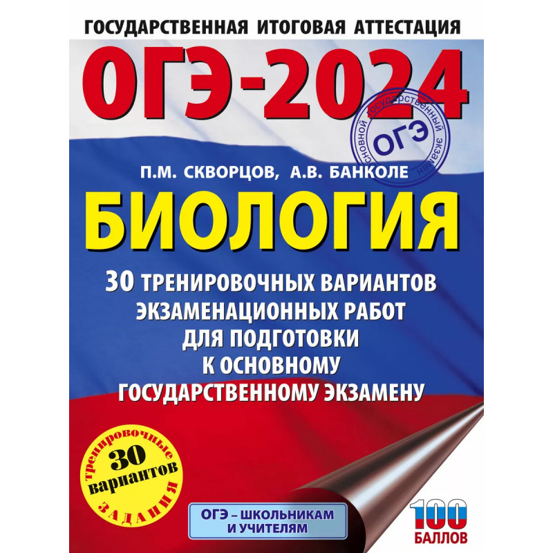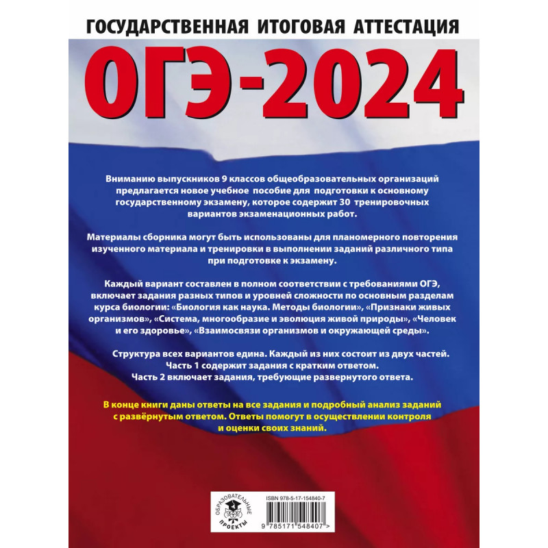 ОГЭ-2024. Биология (60x84, 8). 30 тренировочных вариантов экзаменационных работ для подготовки к осно. Вниманию учащихся и учителей предлагается новое учебное пособие, которое поможет успешно подготовиться к основному государственному экзамену по биологии в 9 классе. Сборник содержит 3 тренировочных вариантов экзаменационных работ. Каждый вариант составлен в соответствии с требованиями ОГЭ, включает задания разных типов и уровня сложности. В конце книги даны ответы на все задания. Предлагаемые тренировочные варианты помогут учителю организовать подготовку к основному государственному экзамену, а учащимся - самостоятельно проверить свои знания и готовность к сдаче выпускного экзамена.